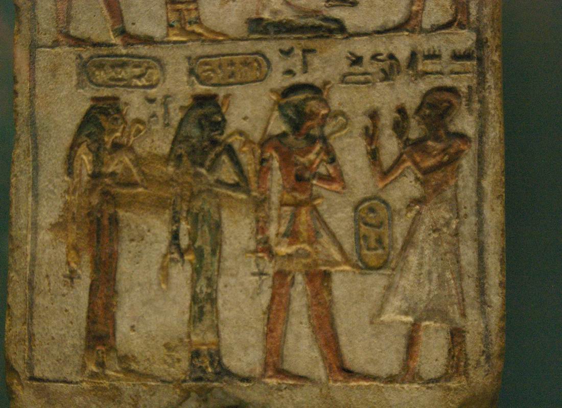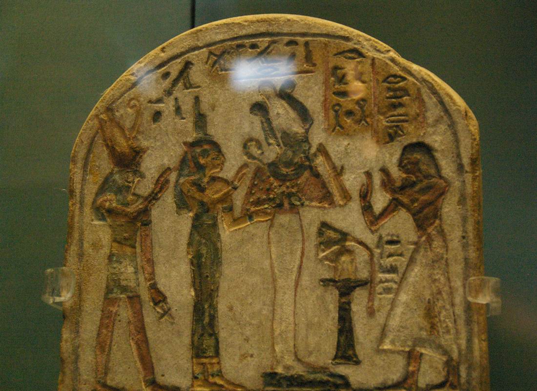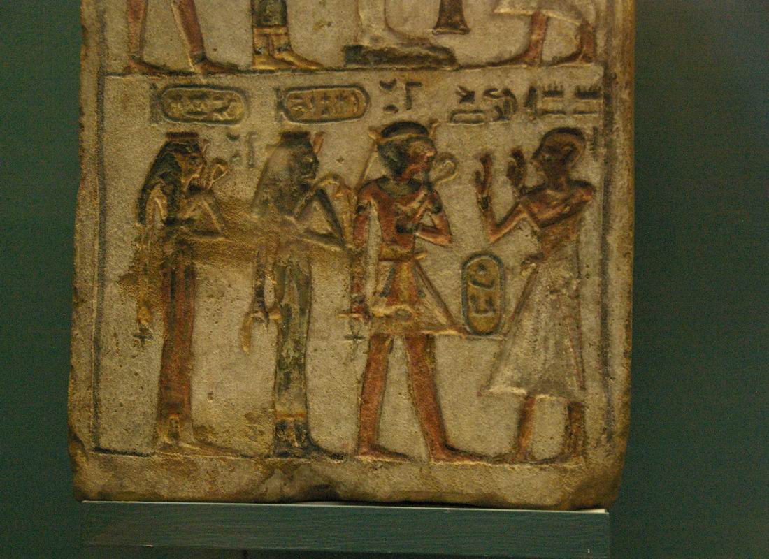 | Stèle d'adoration à la triade Osirienne, dans le registre du haut, et scène d'adoration à Amenhotep Ier, à sa mère, la reine Ahmes-Nefertari, et à son épouse la reine Merytamon, qui ne lui donna pas d'héritier. Le couple formé par le pharaon Amenhotep Ier et sa mère, la reine Ahmes-Nefertari, associé ou séparément, a fait l'objet dans la région thébaine d'un culte à la fois officiel et populaire extraordinairement actif, dont l'évolution est étonnante : il ne commence qu'un siècle environ après leur décès, à la XIXème dynastie, et se poursuit pendant environ quatre siècles, jusqu'à la fin de la XXIème dynastie, avant de disparaître totalement : à l'époque ptolémaïque, il n'y a plus aucune trace des deux personnages. | ||||