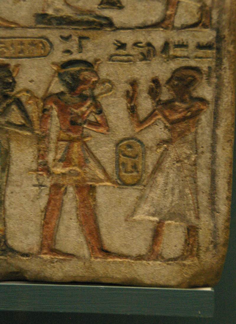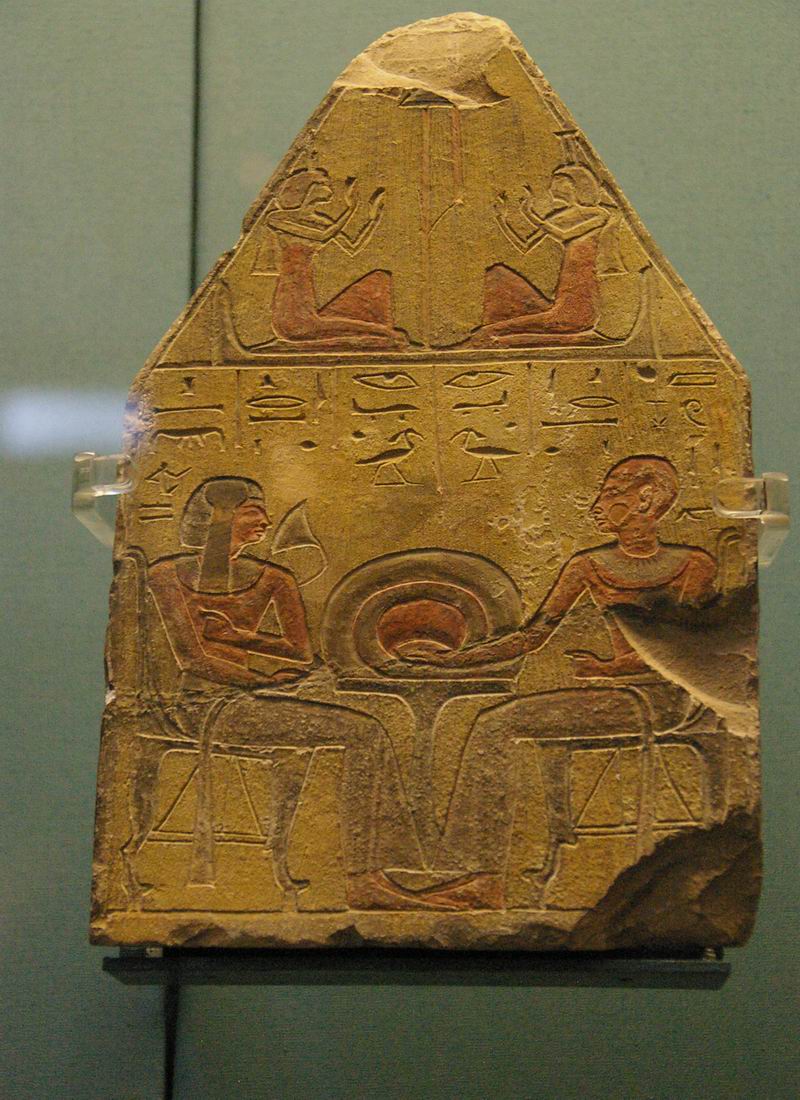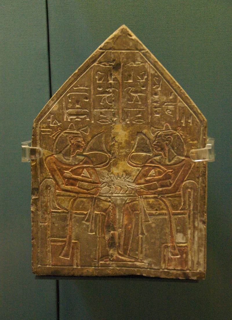 Stèle de forme pyramidale. Dans le triangle du haut de la stèle les déesses Isis et Nephthys, assissent en tailleur sur le hiéroglyphe de l'horizon, saluent le signe de l'Occident. Au-dessous un homme, au crâne rasé, fait face à un enfant, portant la mèche qui le caractérise. Tous les deux sont assis sur un fauteuil, possédant un haut dosseret, et reposant sur des cales, l'homme et l'enfant tiennent une étoffe dans une main. |