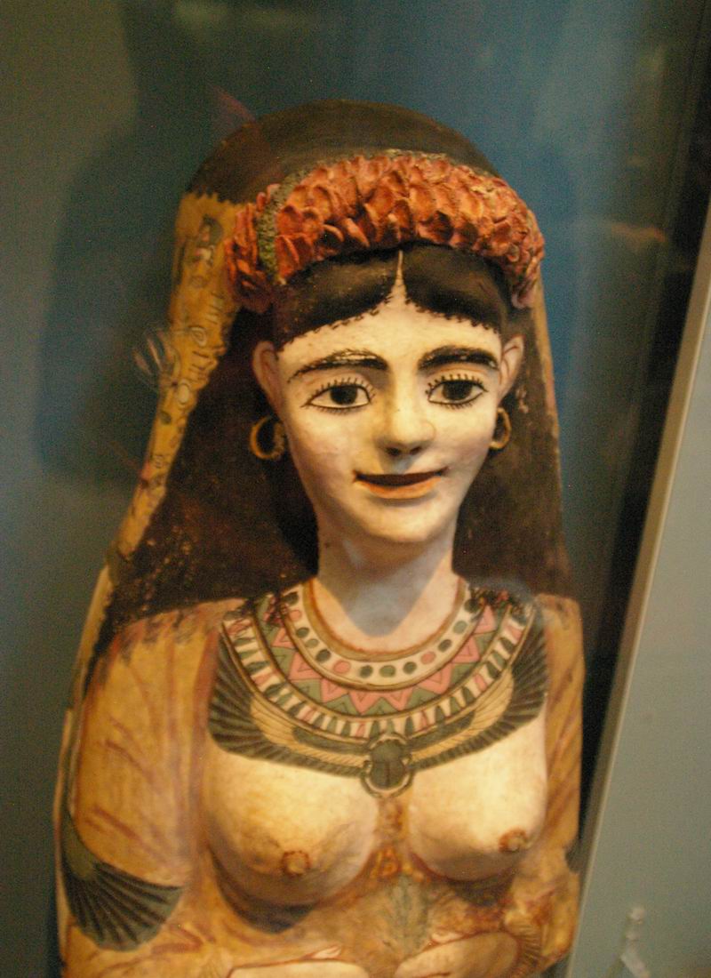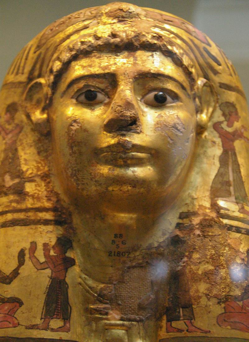 | Au niveau du cou l'on aperçoit le lin qui était stuquée pour réaliser ce type de masque funéraire. | ||||
