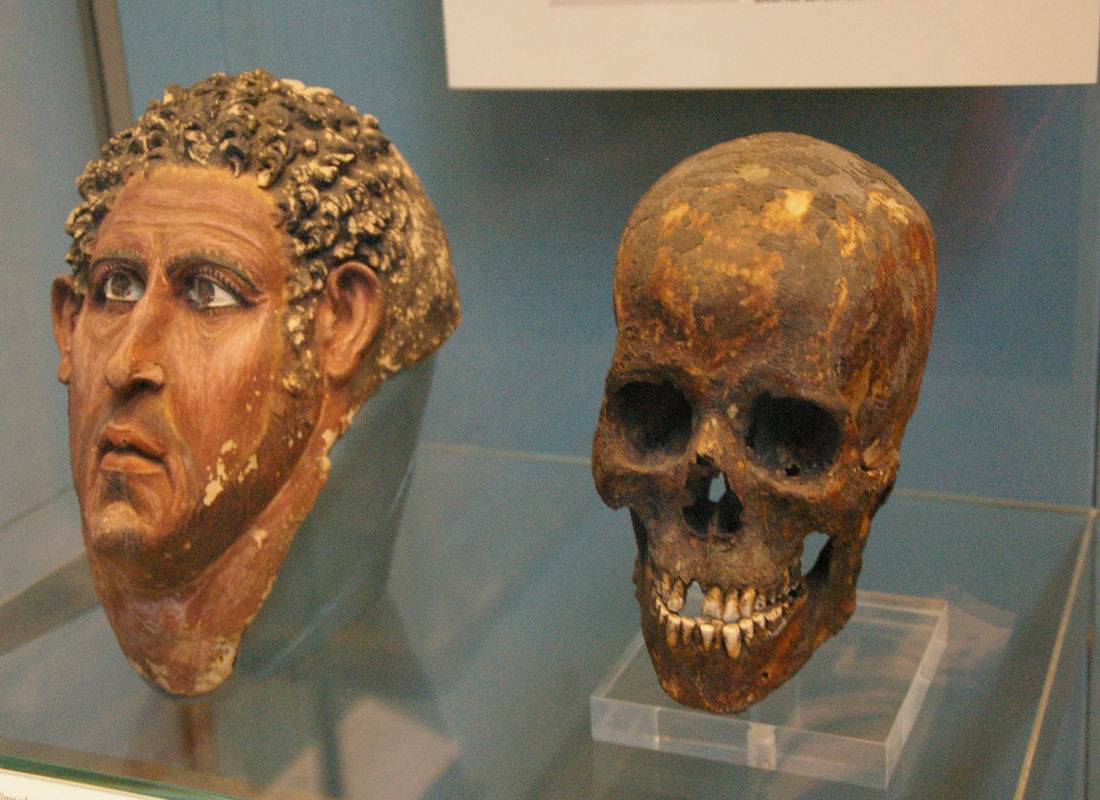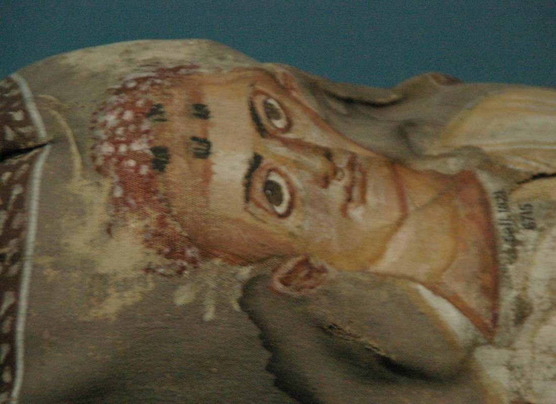 moulage qui le recouvrait corrobore bien à la mention citée au-dessus. Cette tête d'une momie en plâtre obéit au canon des représentations impériales romaines du Ier siècle de notre ère. |