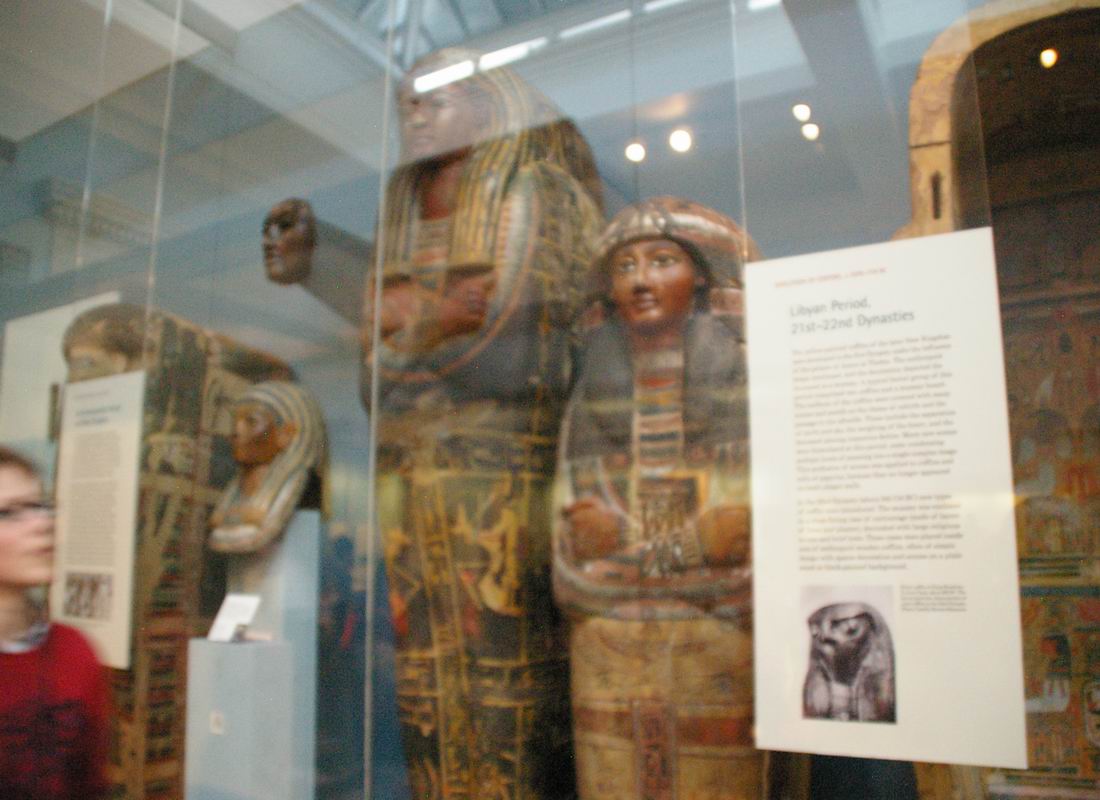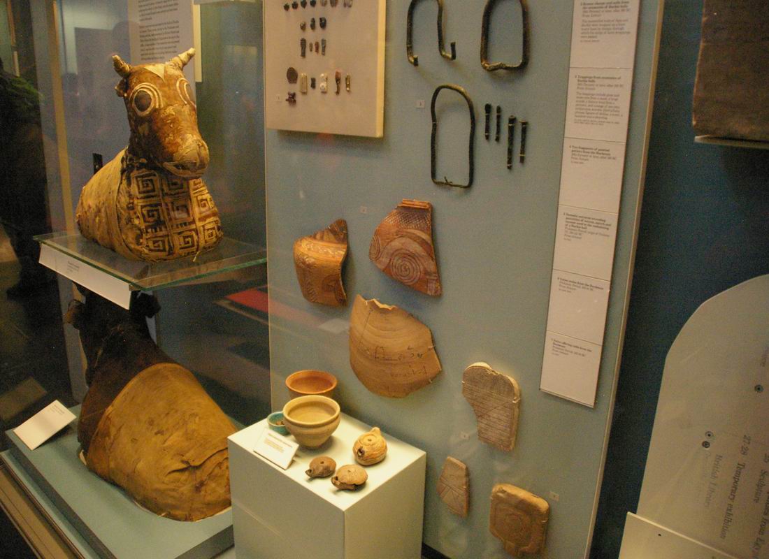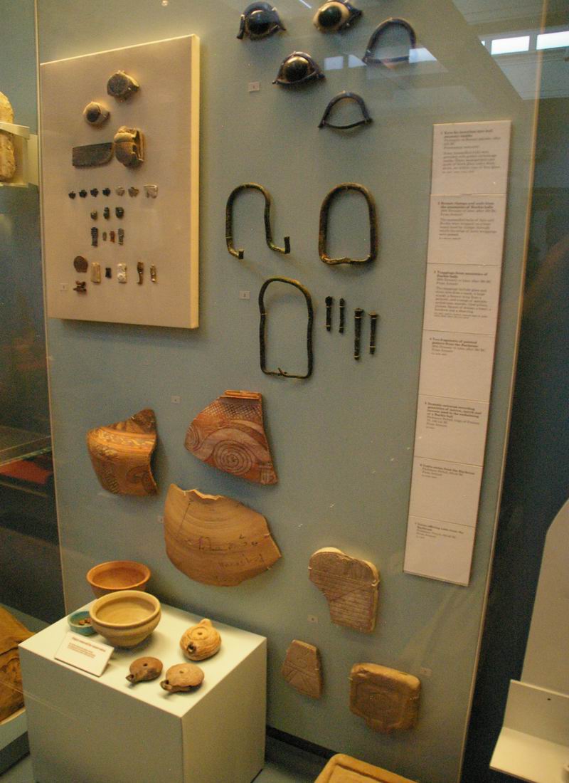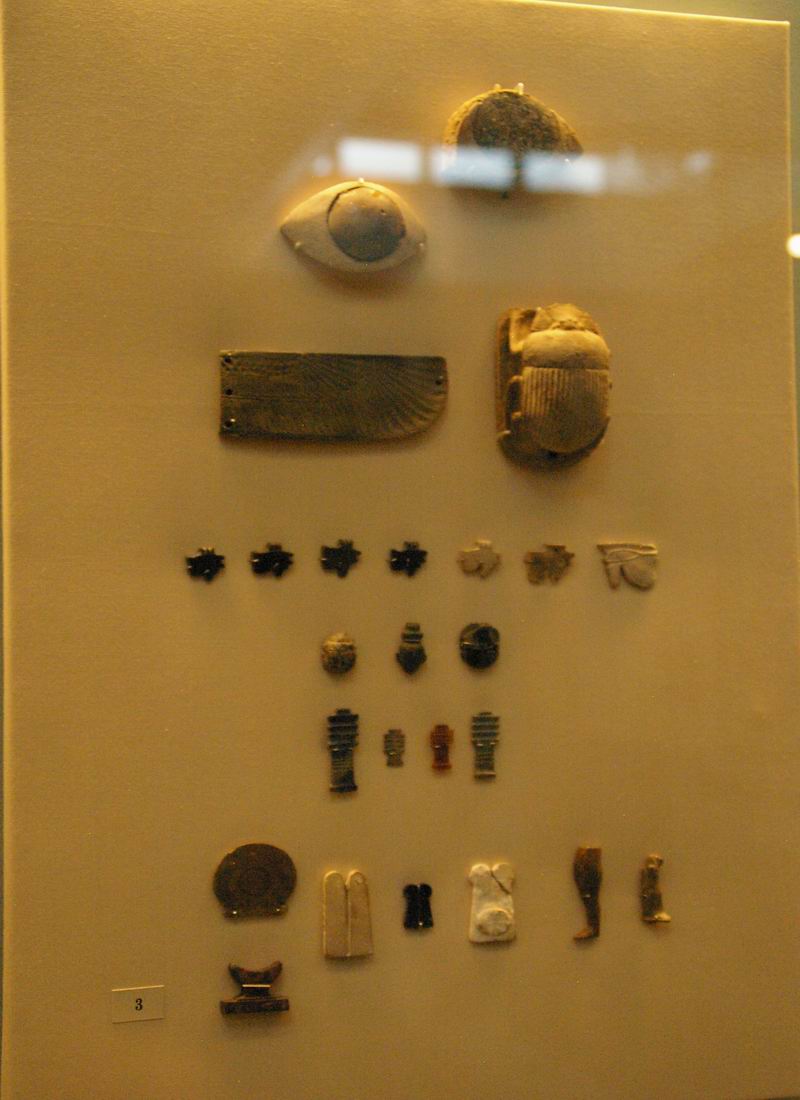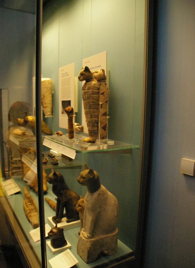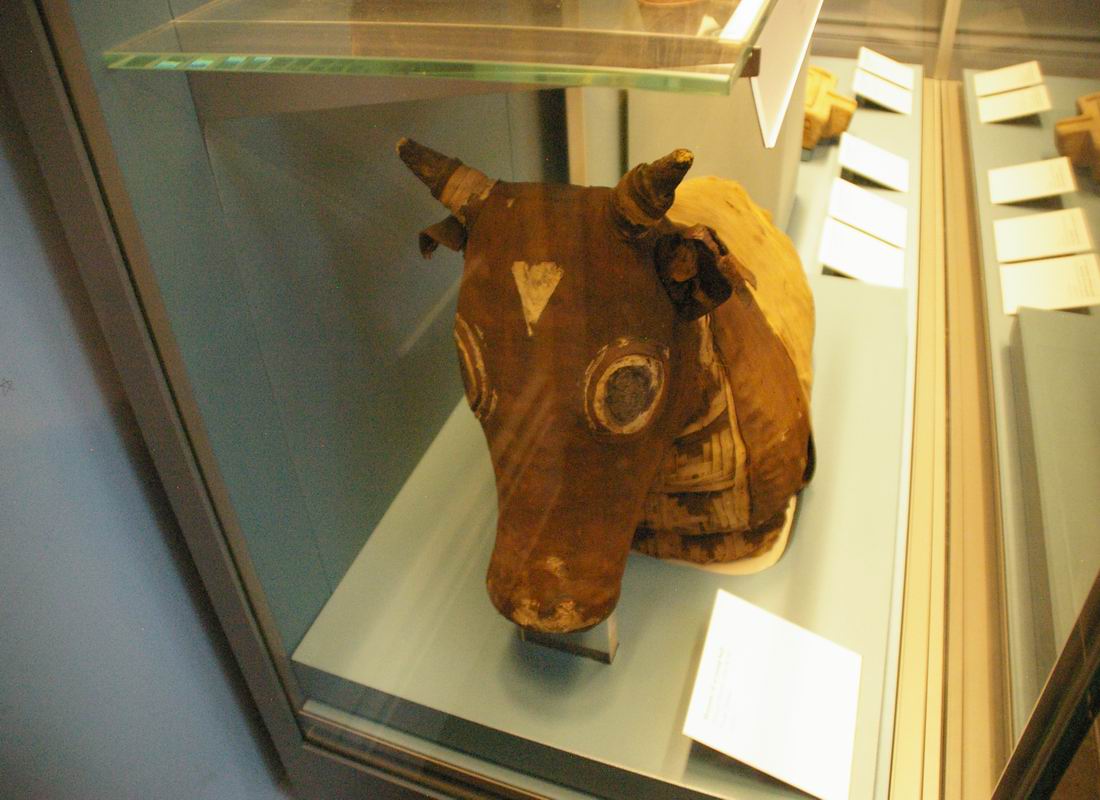 | Vitrine avec momies de bovidé, vases, lampes, amulettes, stèles...etc. |