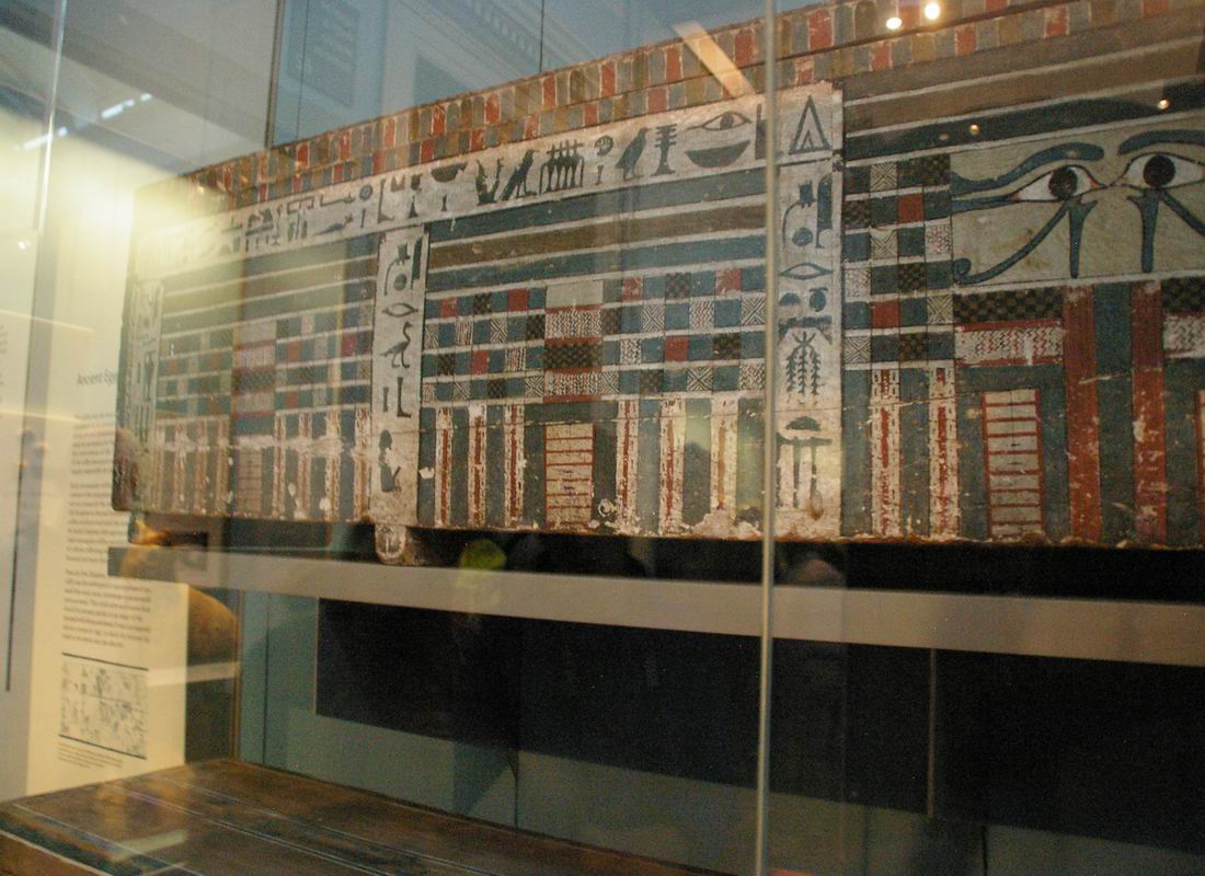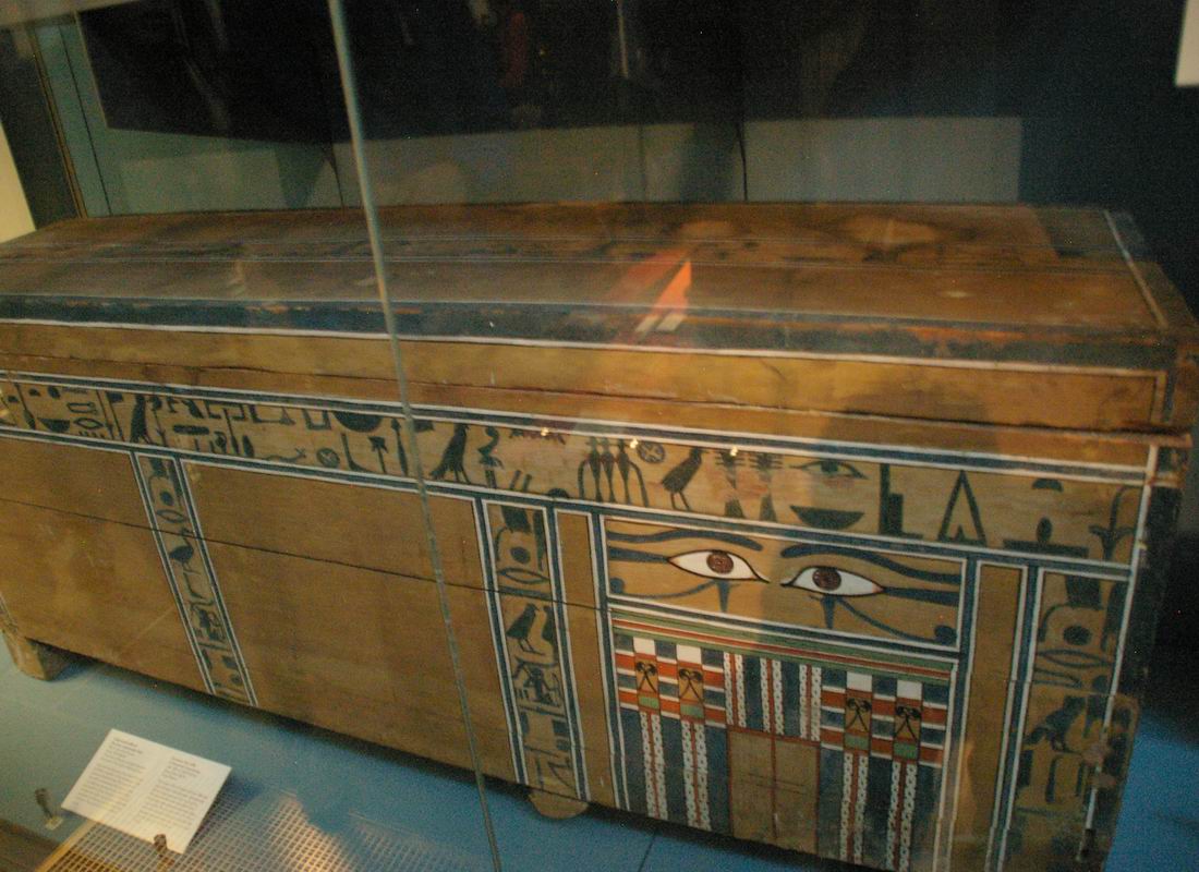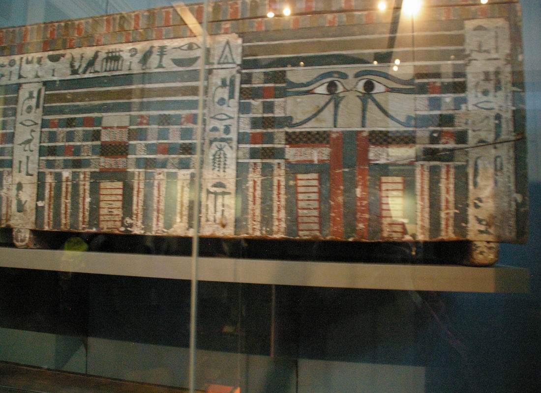 | Sarcophage parallélépipédique dont le décor extérieur comporte des prières pour les offrandes et une grande paire d'yeux peinte sur le côté tourné vers l'Est. Ceci afin de permettre au défunt de "voir" le soleil levant. |