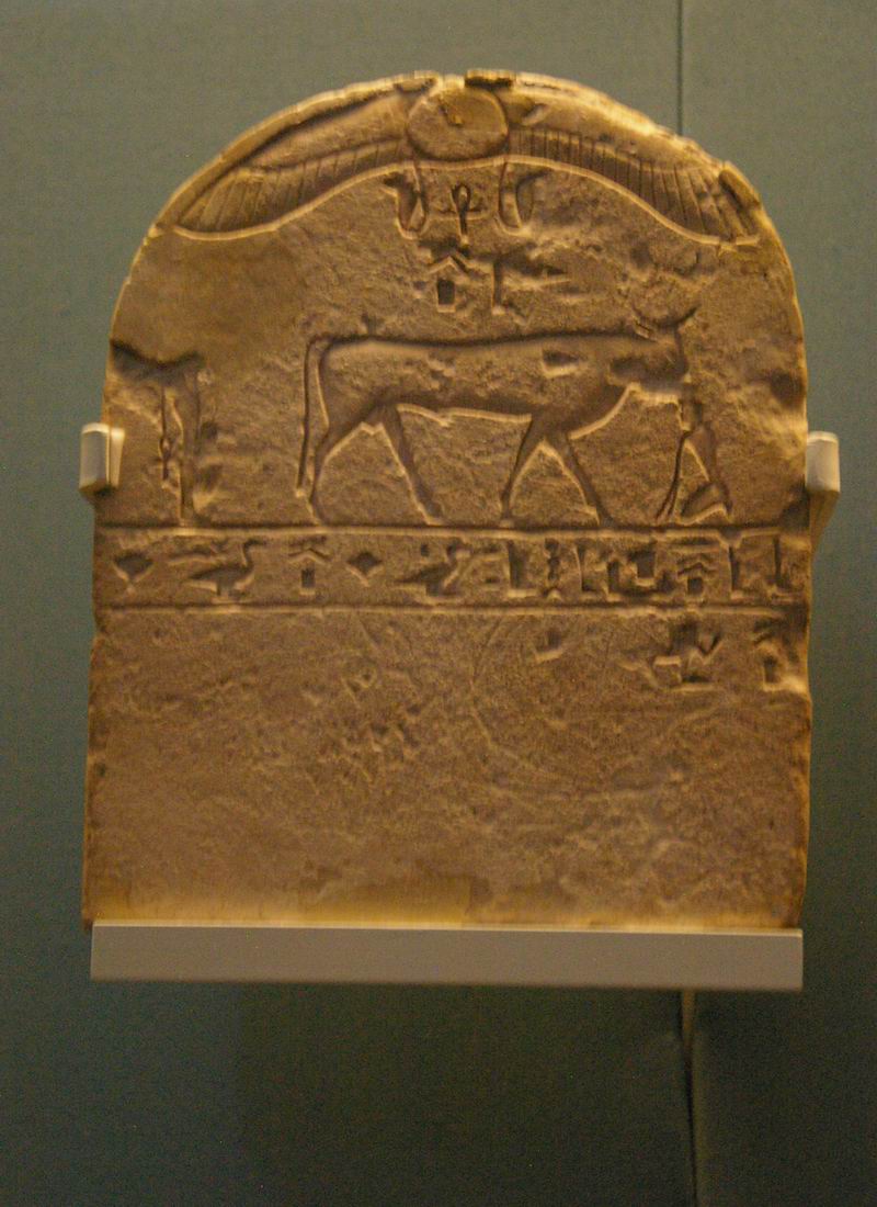 Apis. Le cintre de la stèle est gravé du disque solaire ailé et sous celui-ci figure le nom du taureau : Apis. |