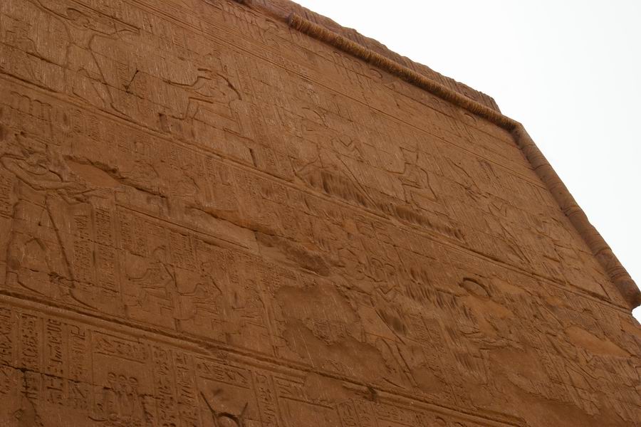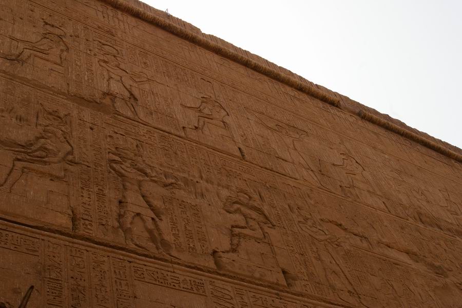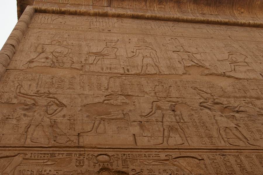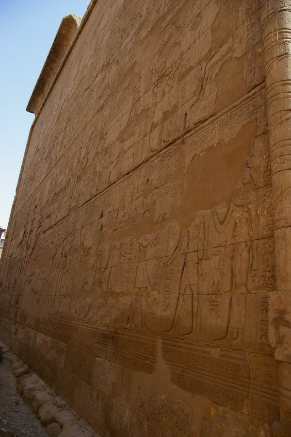 | Le soubassement est décoré d'une procession de "cartouches forteresses", qui symbolisent les peuplades ennemis du pays d'Égypte. |