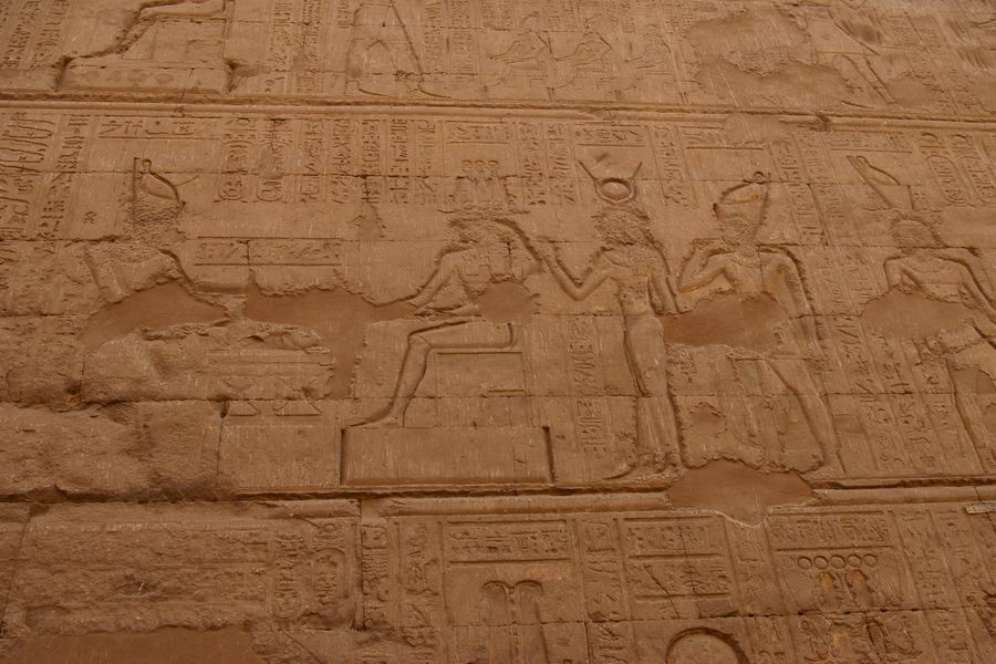 | Sur les deux registres supérieurs, le roi est placé devant des divinités, dont il apporte des offrandes. |
