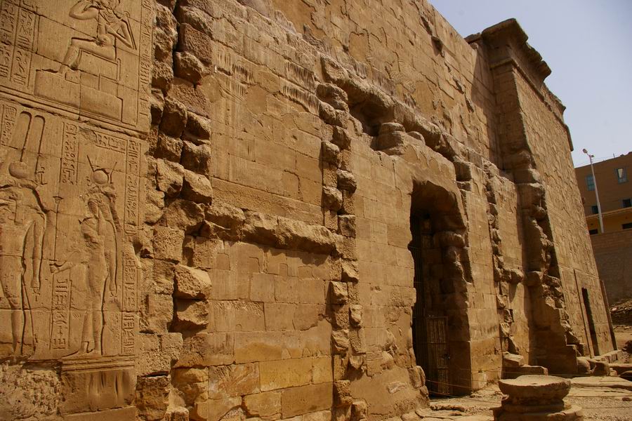 | La partie centrale de ce mur est en fait la façade du temple ptolémaïque, et tout ce qui est visible de ce monument. Sur cette partie ptolémaïque l'on peut encore y lire les cartouches de Ptolémée VI Philométor et de Ptolémée VIII Évergète II. |