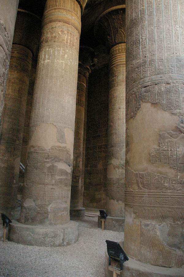 | Après le passage de la porte d'entrée, l'on pénètre dans la salle hypostyle qui est la seule pièce conservée du temple |