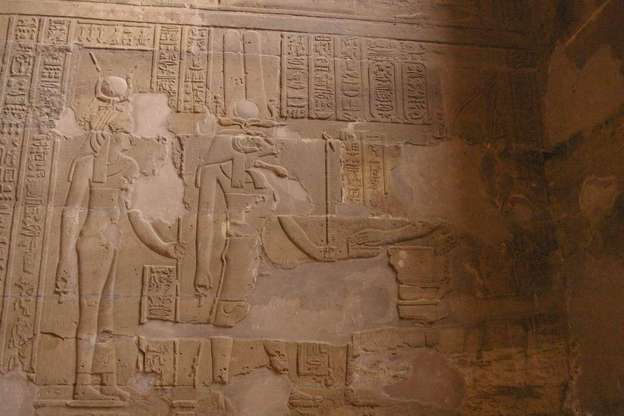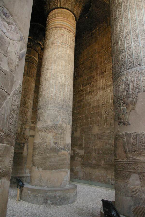 colonnes de la salle hypostyle ont une hauteur de 13,30 m. Dans la partie basse des fûts des colonnes nous trouvons le roi faisant une offrande devant une divinité. |