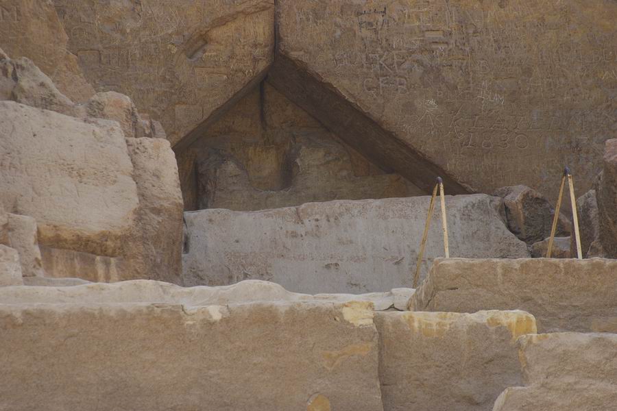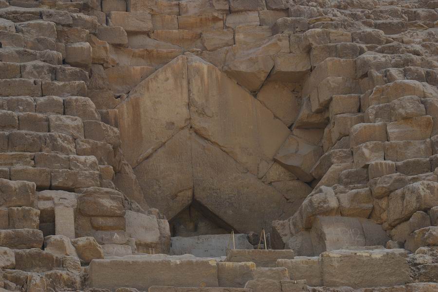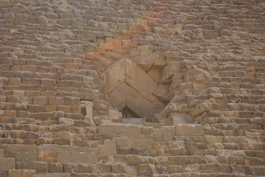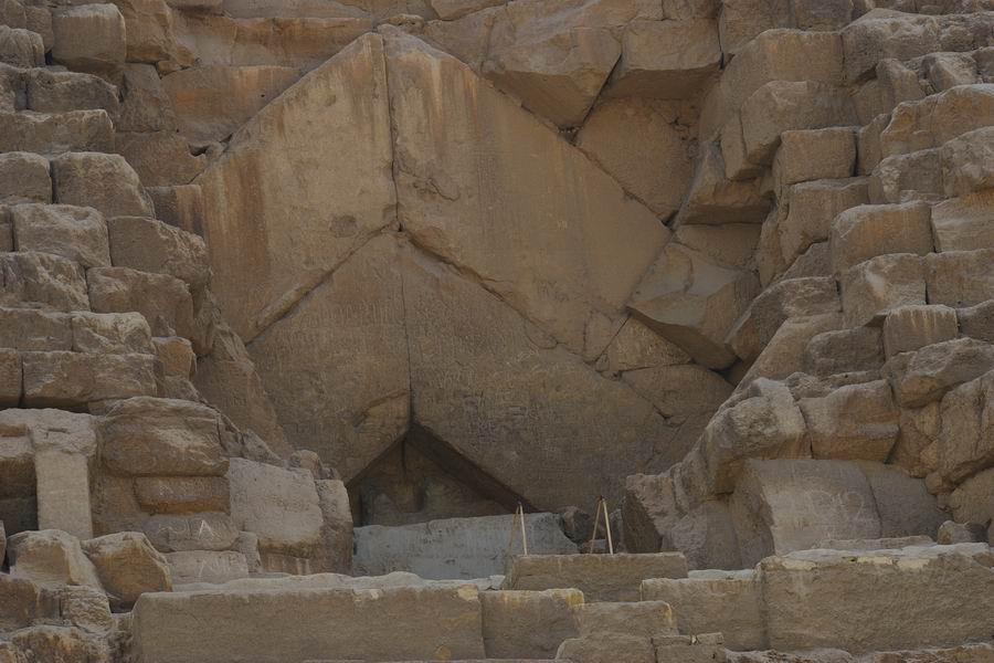 | Sur la face Nord de la pyramide, au niveau de la treizième assise, à une quinzaine de mètres de hauteur, à environ 7 m à l'Est de l'axe de la face nous trouvons l'entrée normale de la pyramide. Au niveau de la cinquième assise l'entrée ouverte par le calife Al-Mamoun au IXe siècle est actuellement utilisée par les touristes pour pénétrer dans le monument. |