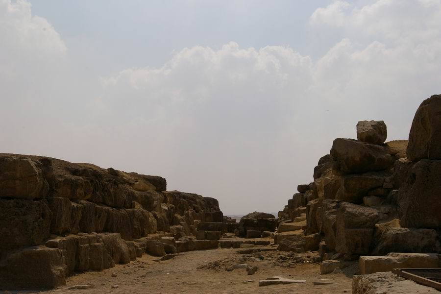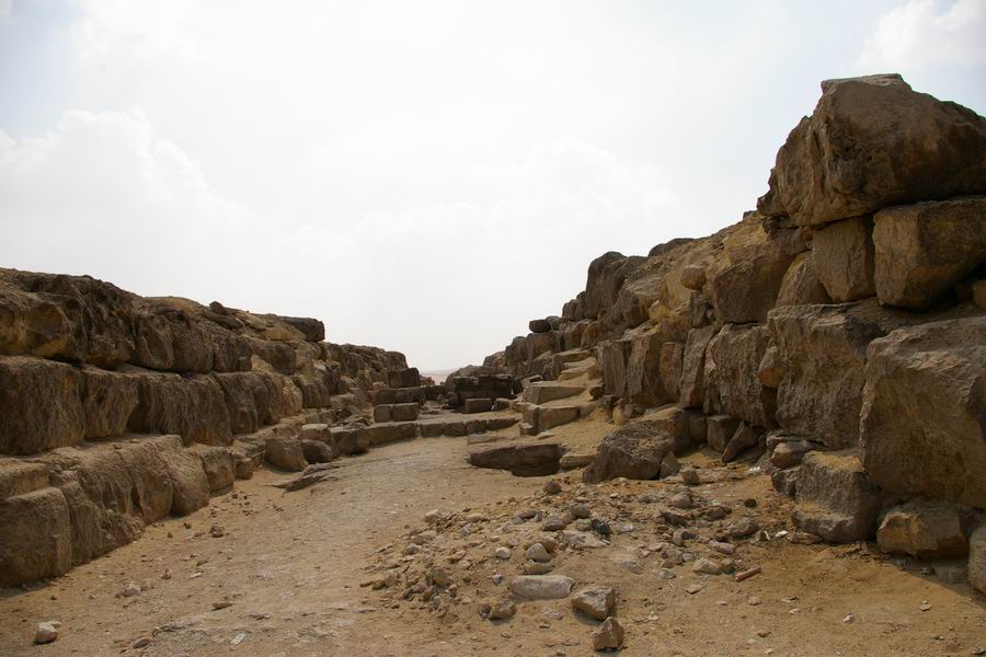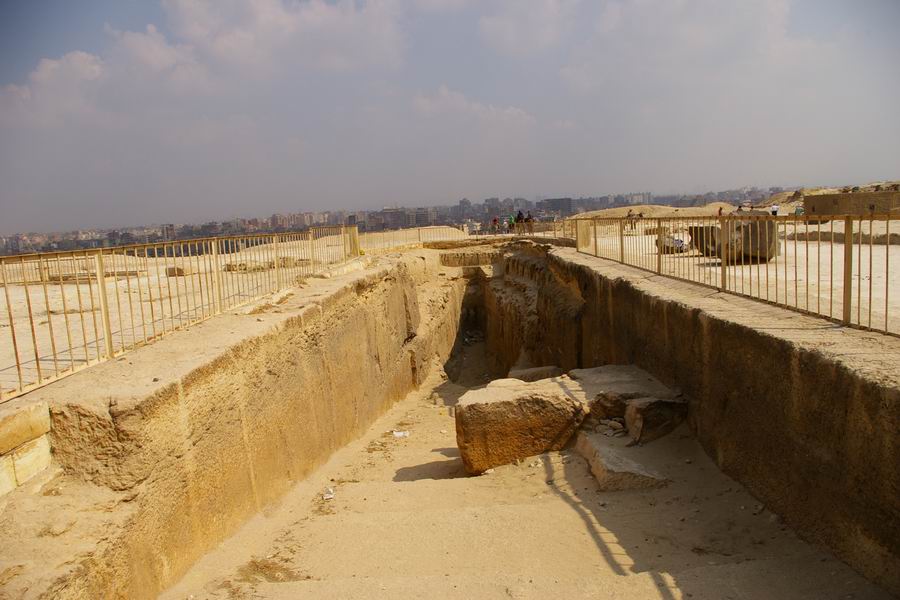 | La troisième fosse, plus étroite, est située dans le prolongement de la chaussée reliant le temple bas et le temple funéraire accolé sur la face Est de la pyramide. |