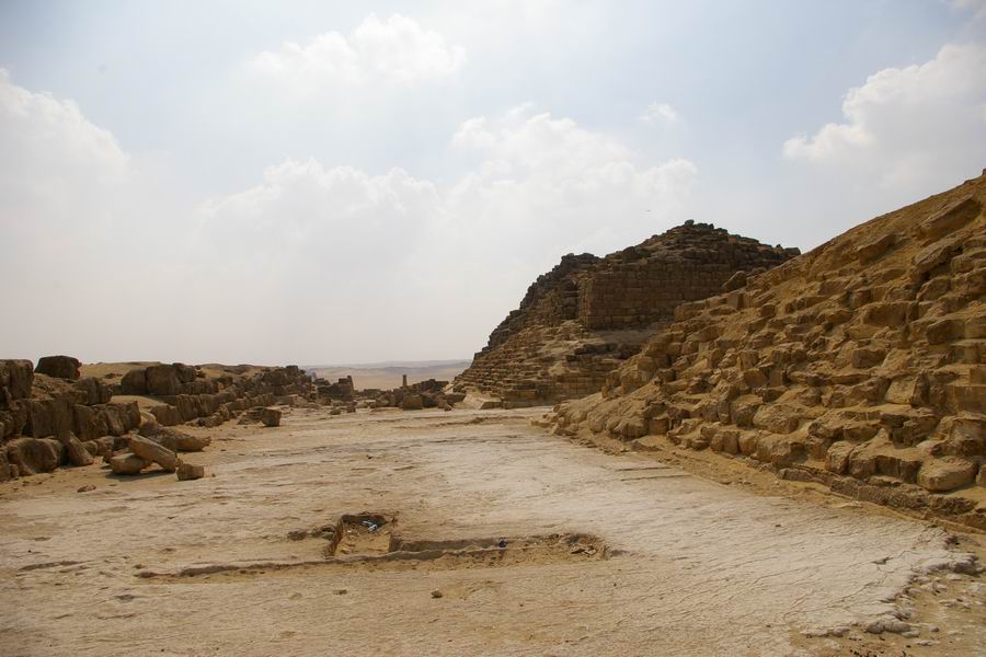 | A l'Est de la pyramide de Khéops s'alignent trois pyramides satellites et une nécropole. Cette nécropole forme une véritable petite ville de mastabas et tombes. |