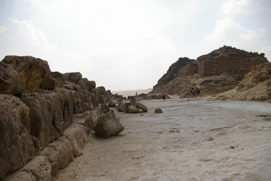 | Il s'agit de tombes de fonctionnaires et des hauts dignitaires de Khéops ayant obtenu la privilège d'être ensevelis à proximité de la pyramide. A droite les trois pyramides secondaires. |