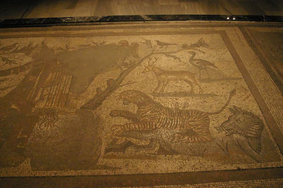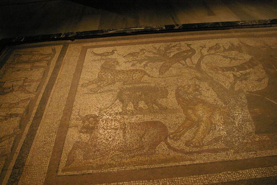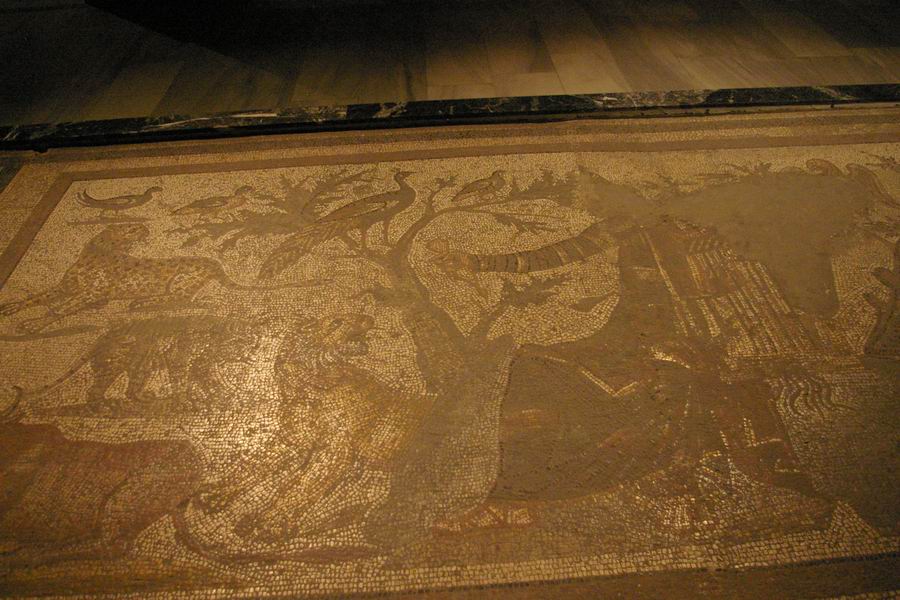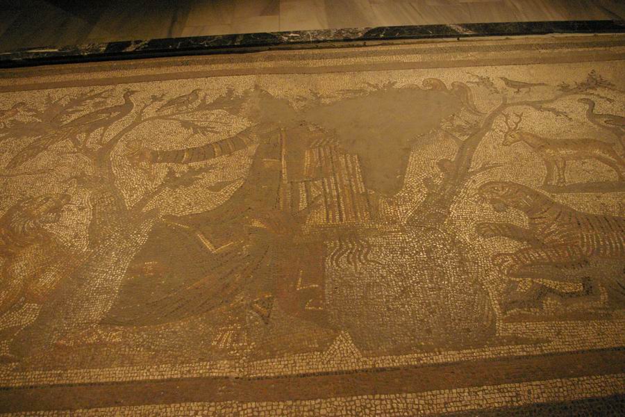 | Les animaux sauvages et Orphée au centre de la mosaïque. | |||