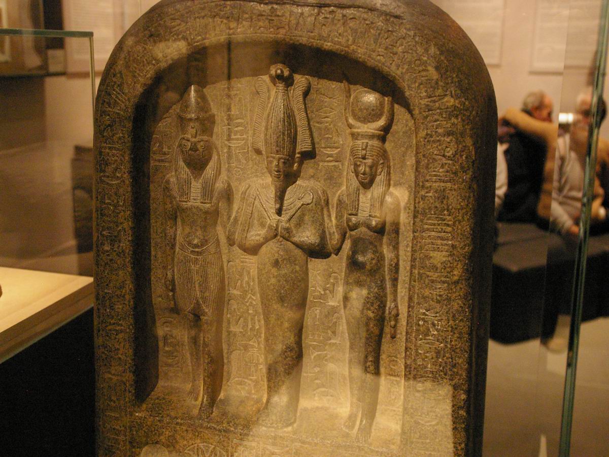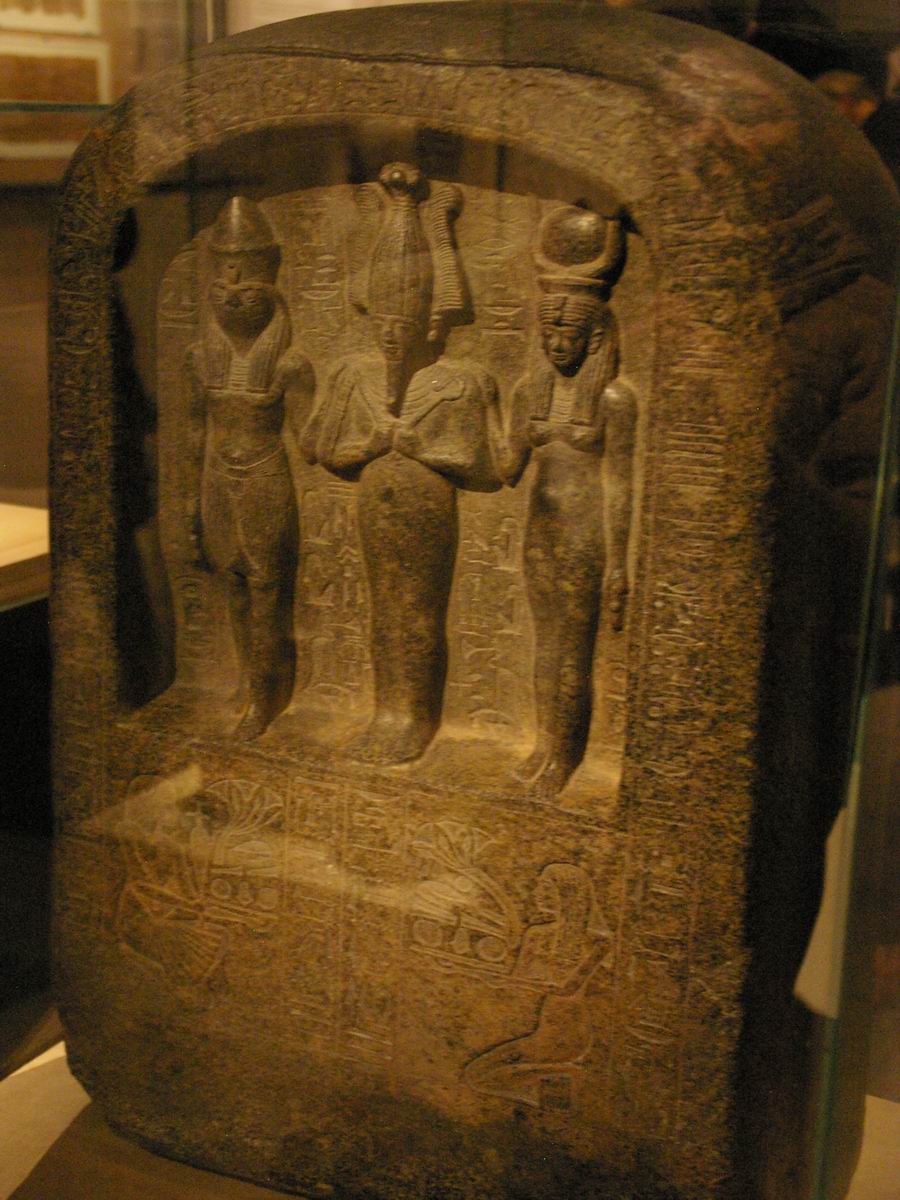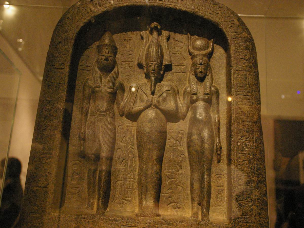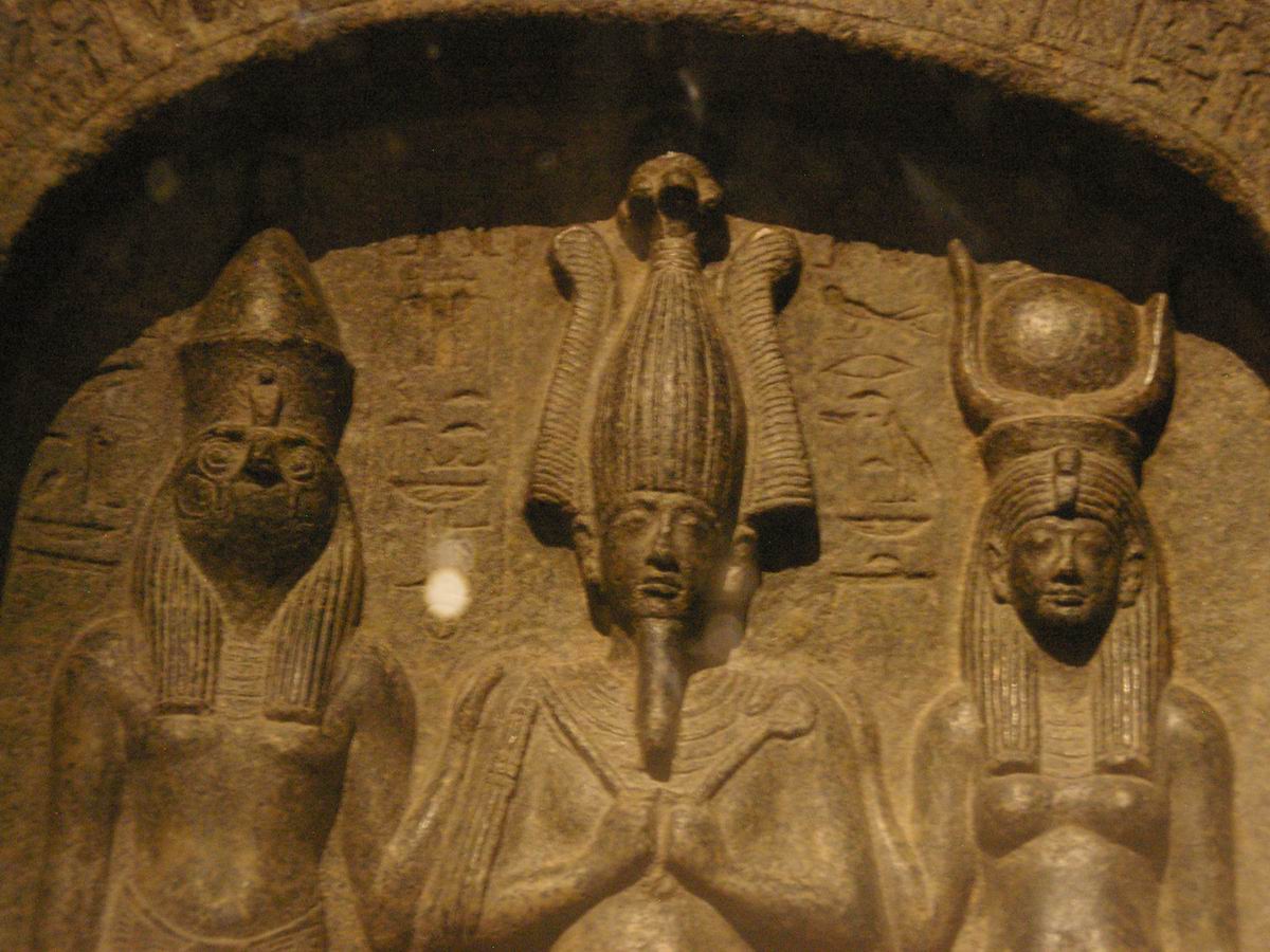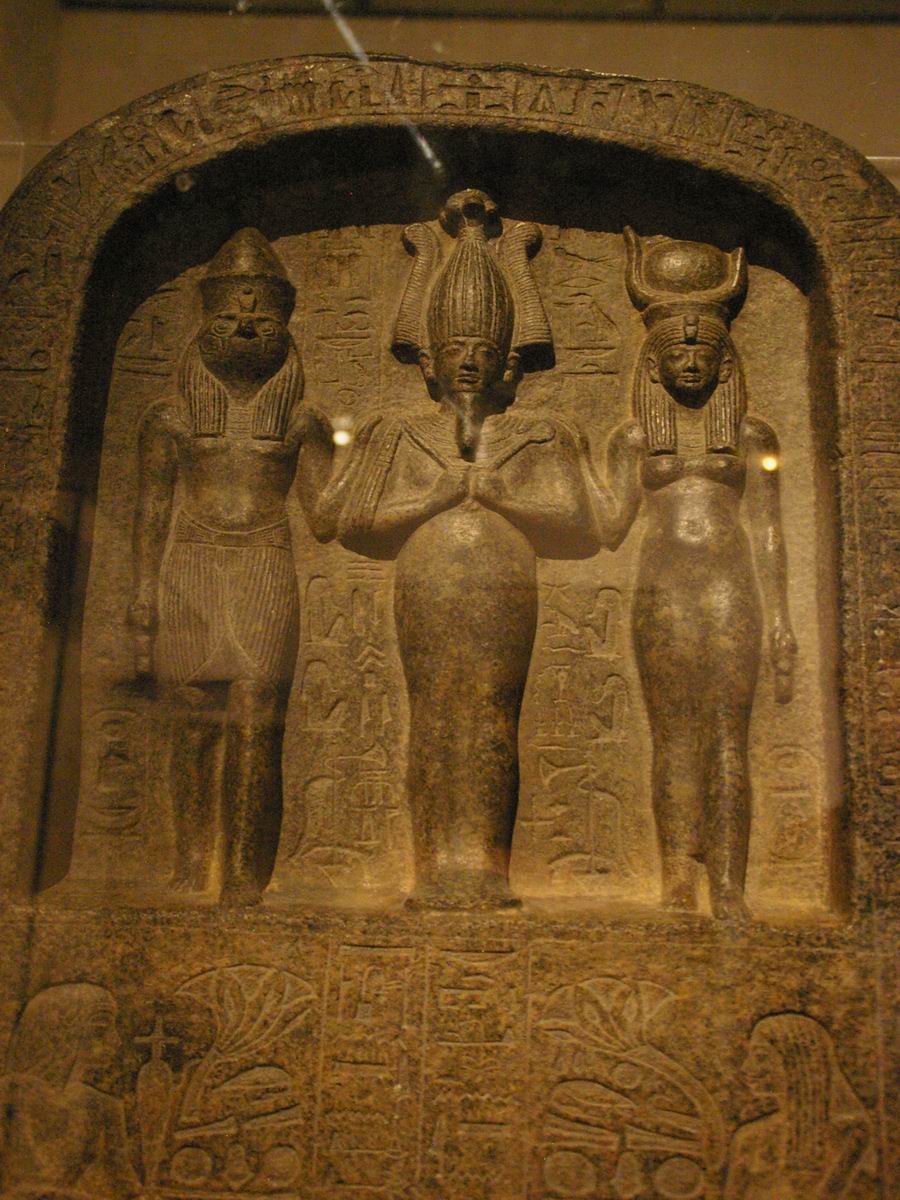 en haut-relief les effigies de la triade osirienne. |