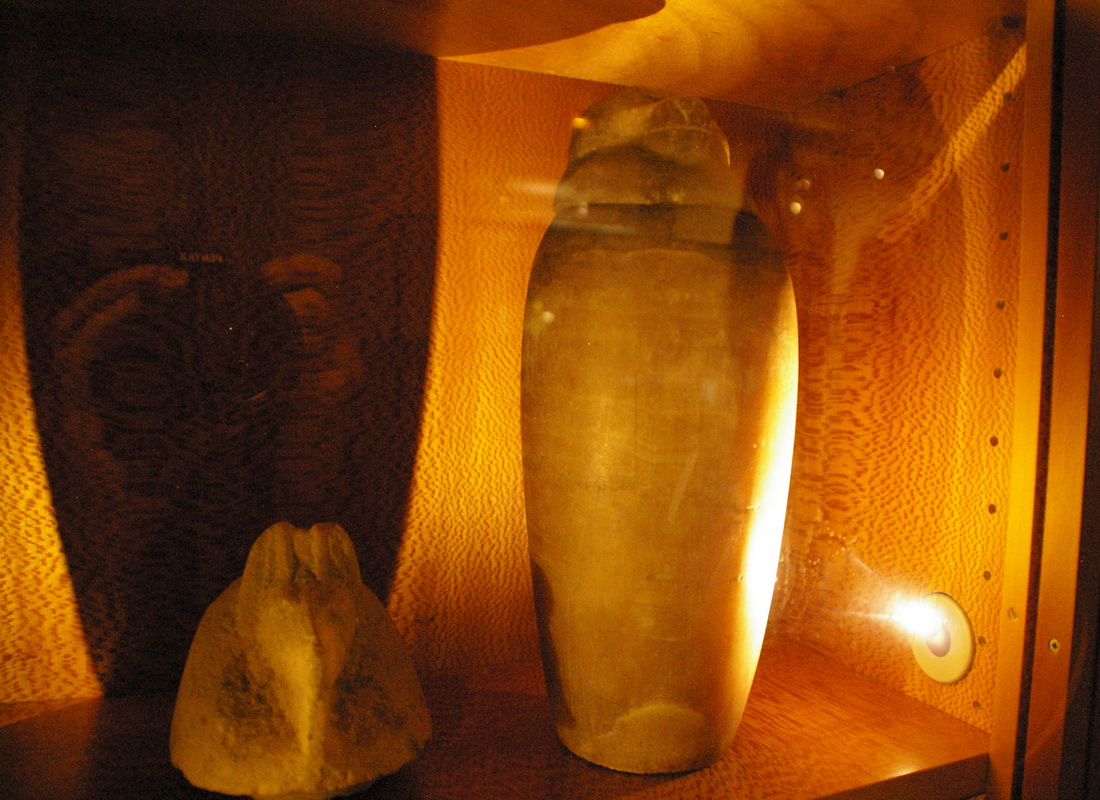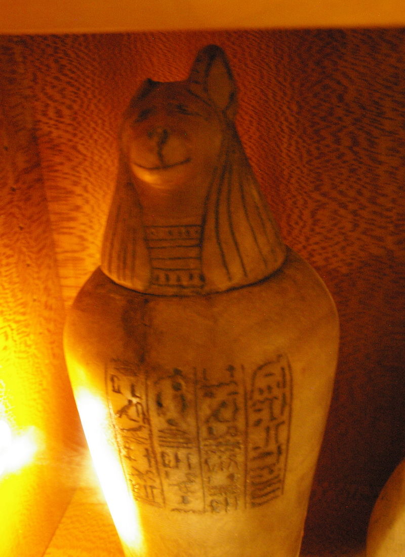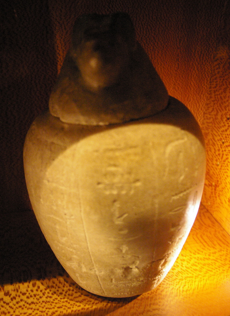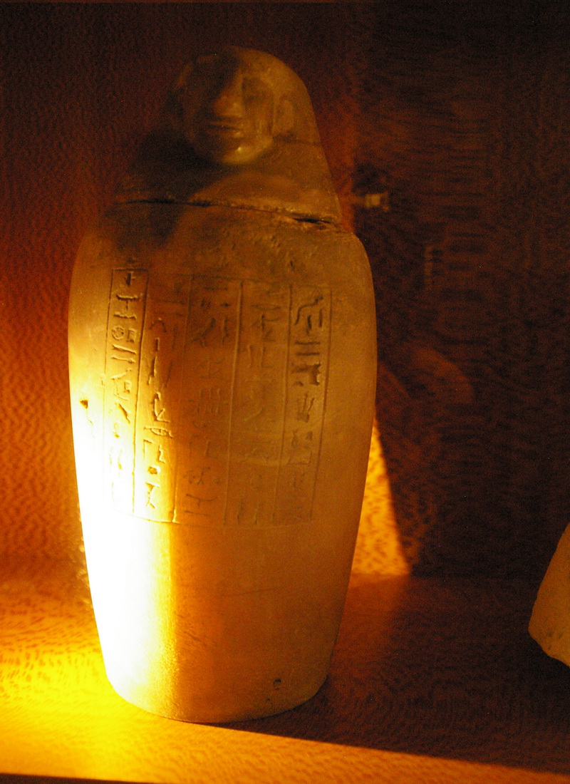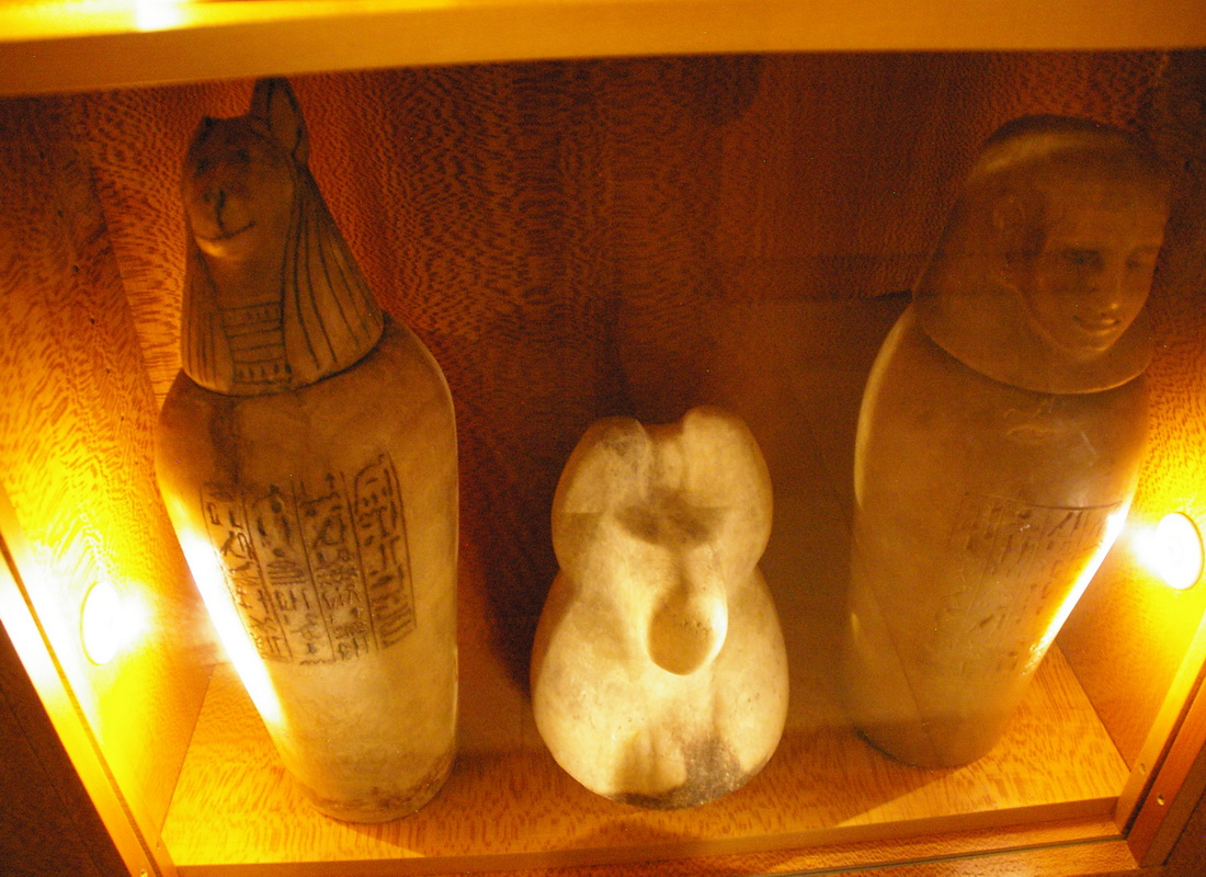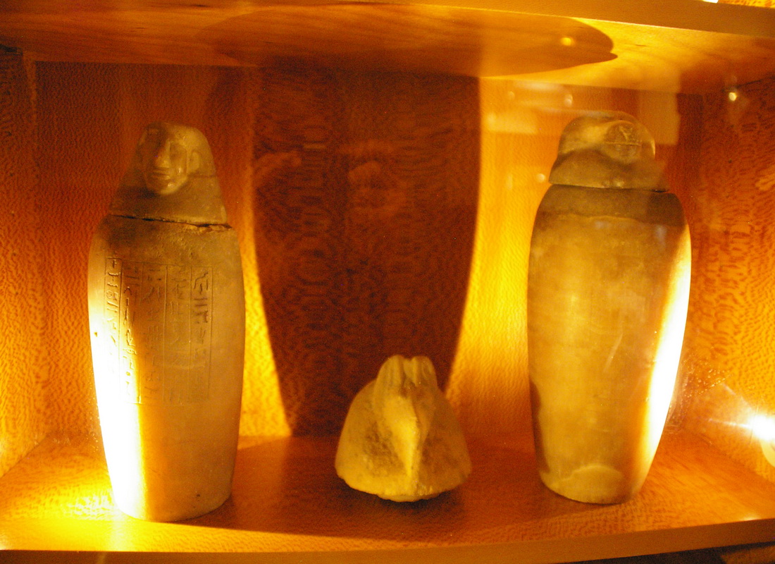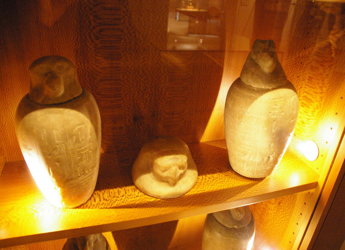 | Les vases-canopes sont des objets de curiosité par excellence d'autant plus qu'ils étaient nombreux. La collection comprend, entre autres, le vase correspondant à la personnalité d'Amsit tiré du mobilier funéraire du «Sem, grand des artisans, Pa-hem-netjer». Le détenteur d'un de ces récipients est le «scribe royal, l'intendant des suivants du seigneur du Double-Pays, Méhy». |