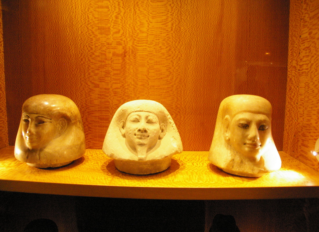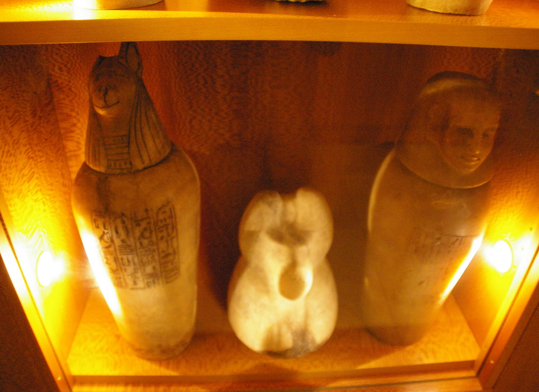 | Vitrine avec des vases canopes et des bouchons de vases. |