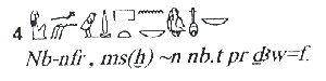 Louqsor. 5 colonnes verticales, 4 colonnes à gauche pour le personnage agenouillé, 1 colonne à droite pour le roi. Une ligne horizontale sous Nebnéfer, le "Surveillant des trésors d'Amon". |