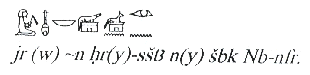 | Fait par le supérieur des mystères, celui de Sobek, Nebnéfer. |