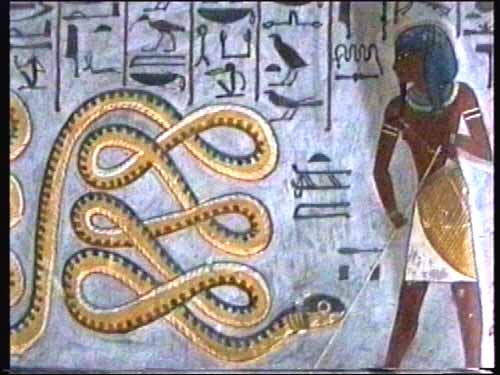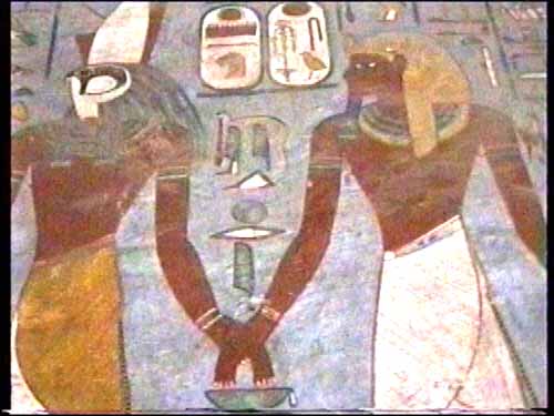 | La tombe de Ramsès Ier , le fondateur de la XIXème dynastie (KV 16) est composée d'une rampe d'accès, d'un corridor, d'une première chambre et de la salle du sarcophage. Seule cette dernière pièce est décorée. Les parois de la salle du sarcophage sont entièrement coloriées. Elles portent une partie du "Livre des Portes". Chaque côté de la salle est orné d'une heure de ce recueil. |
