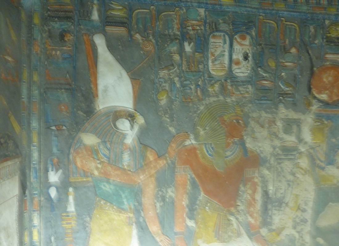 | Horus présente le roi à la déesse Isis qui l'accueille. | ||||||
