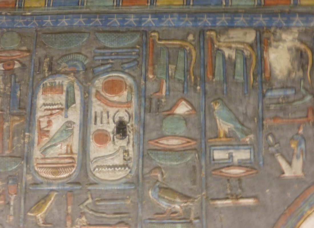 Cartouches d'Horemheb. A droite son nom de couronnement : Djeser-Khéperou-Rê, setep en Rê, les manifestations de Rê sont inaccessibles, l'élu de Rê. A gauche son nom de naissance : Hor-Em-Heb, mery Imen, Horus est en fête, l'aimé d'Amon. |