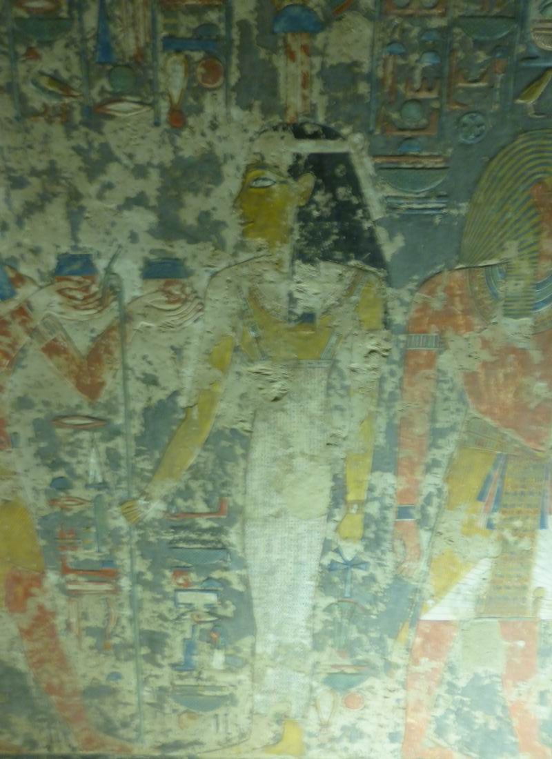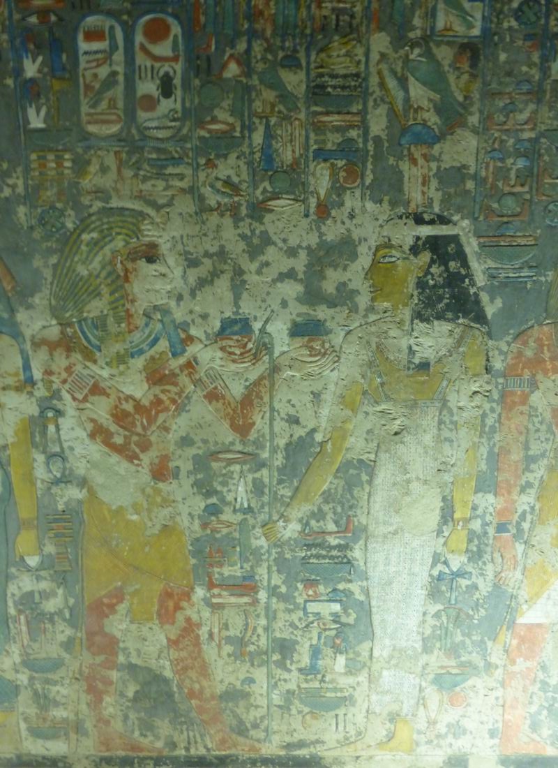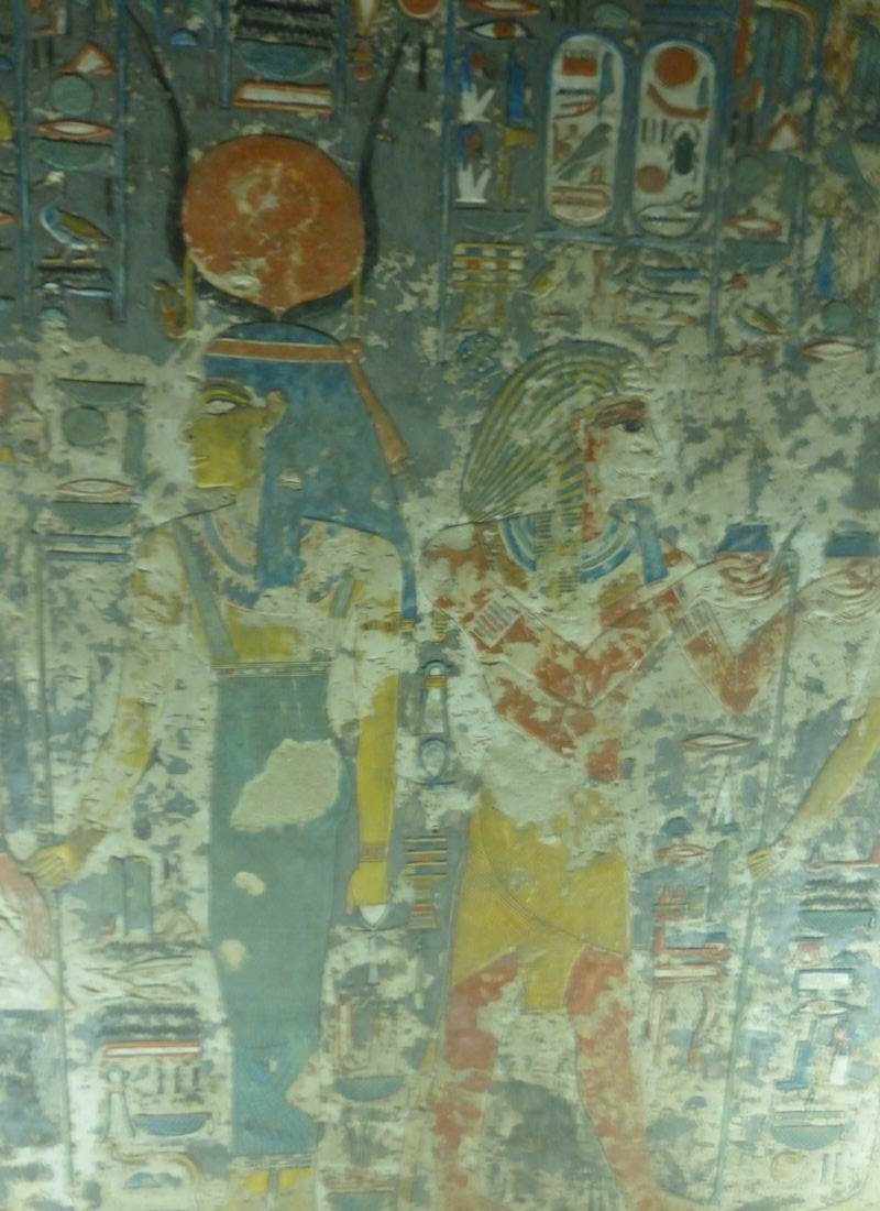 | La déesse Isis, munie de la coiffe d'Hathor, est derrière elle le roi qui offre les vases nou à la déesse Hathor, représentée sous sa forme de la déesse de l'Occident. | ||||||