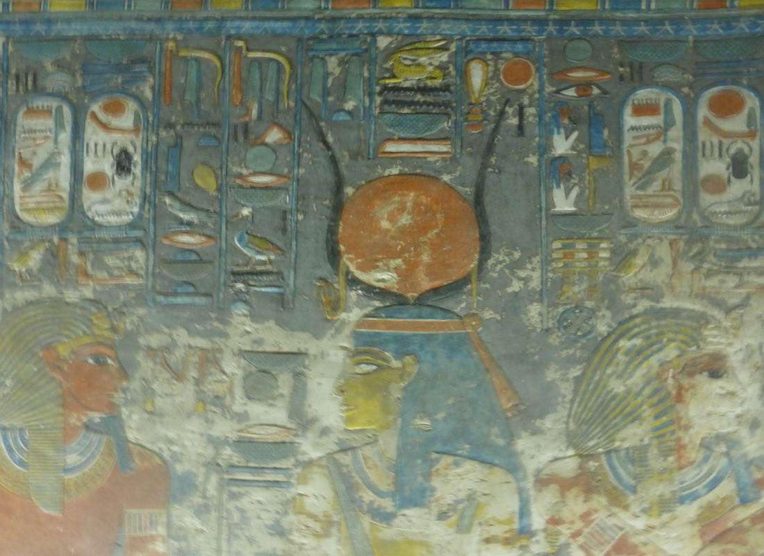 la déesse de l'Occident. Au-dessus du signe de l'Occident l'on aperçoit le nom d'Hathor : "la maison d'Horus" ou "le temple d'Horus (un temple est la maison de la divinité). |