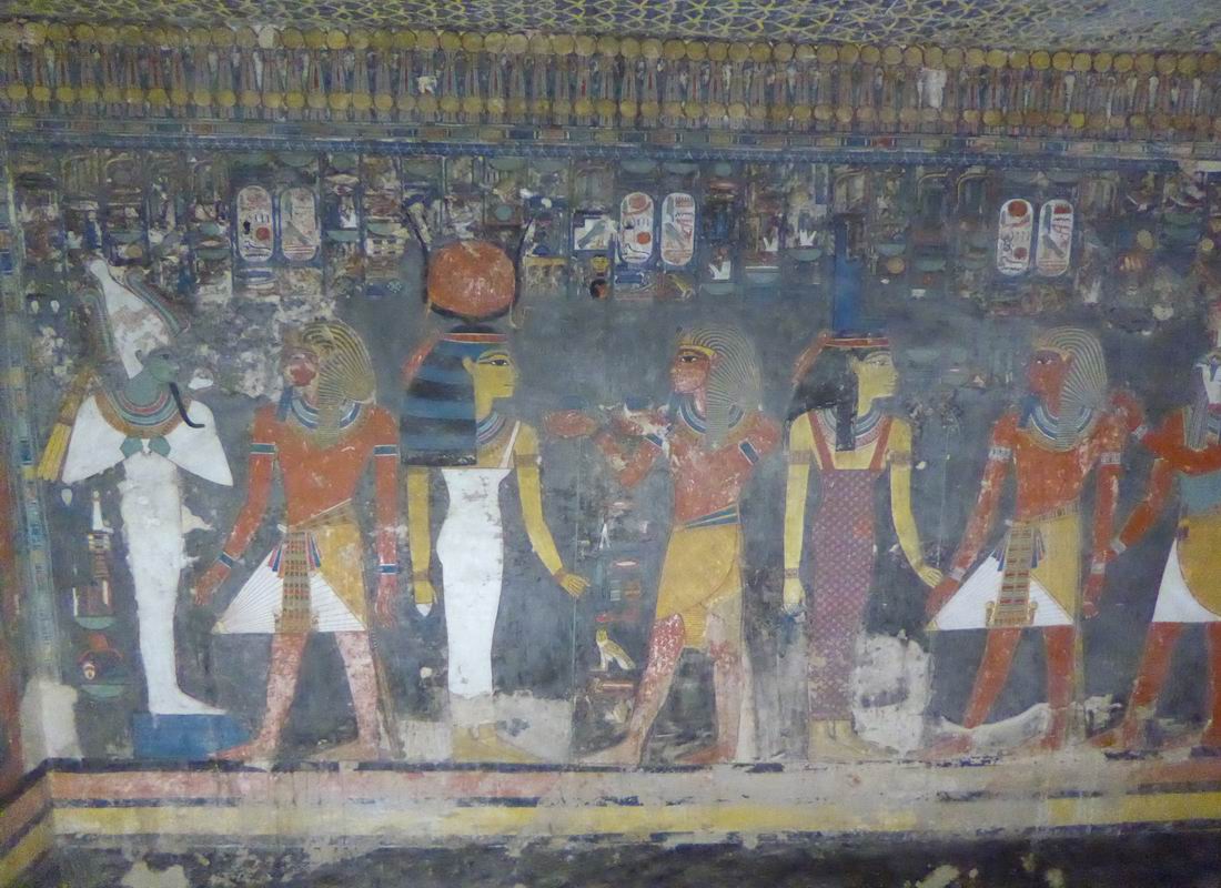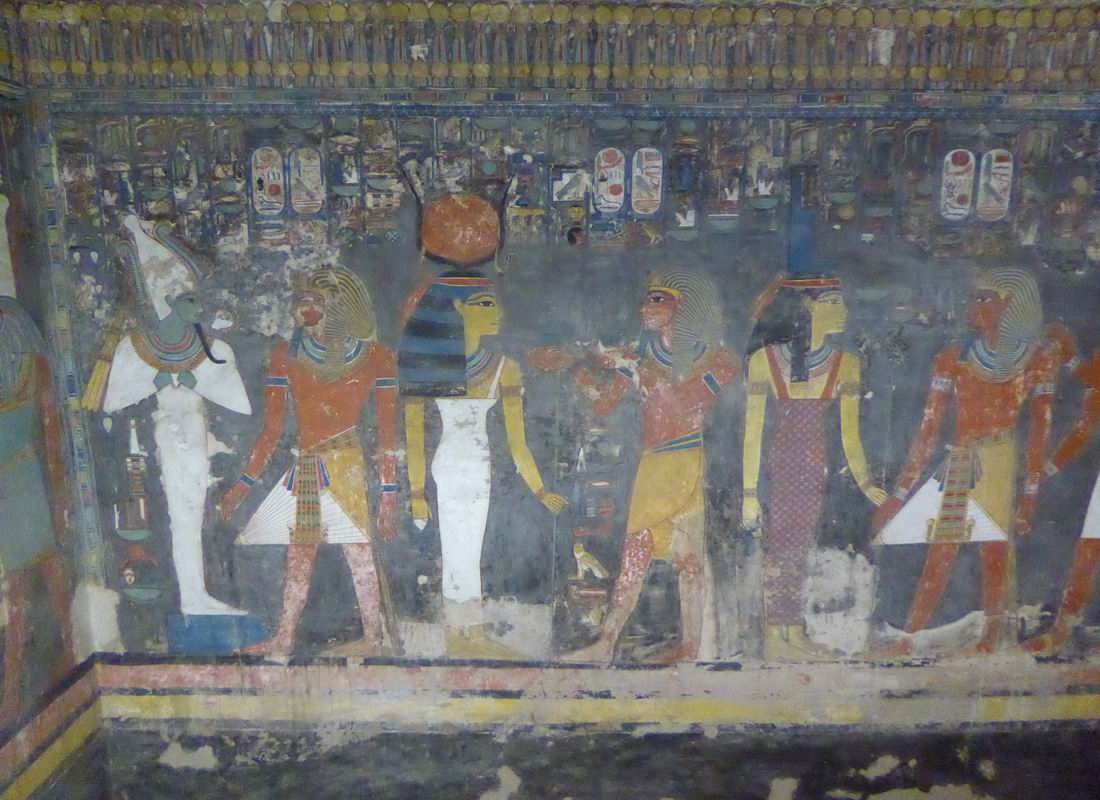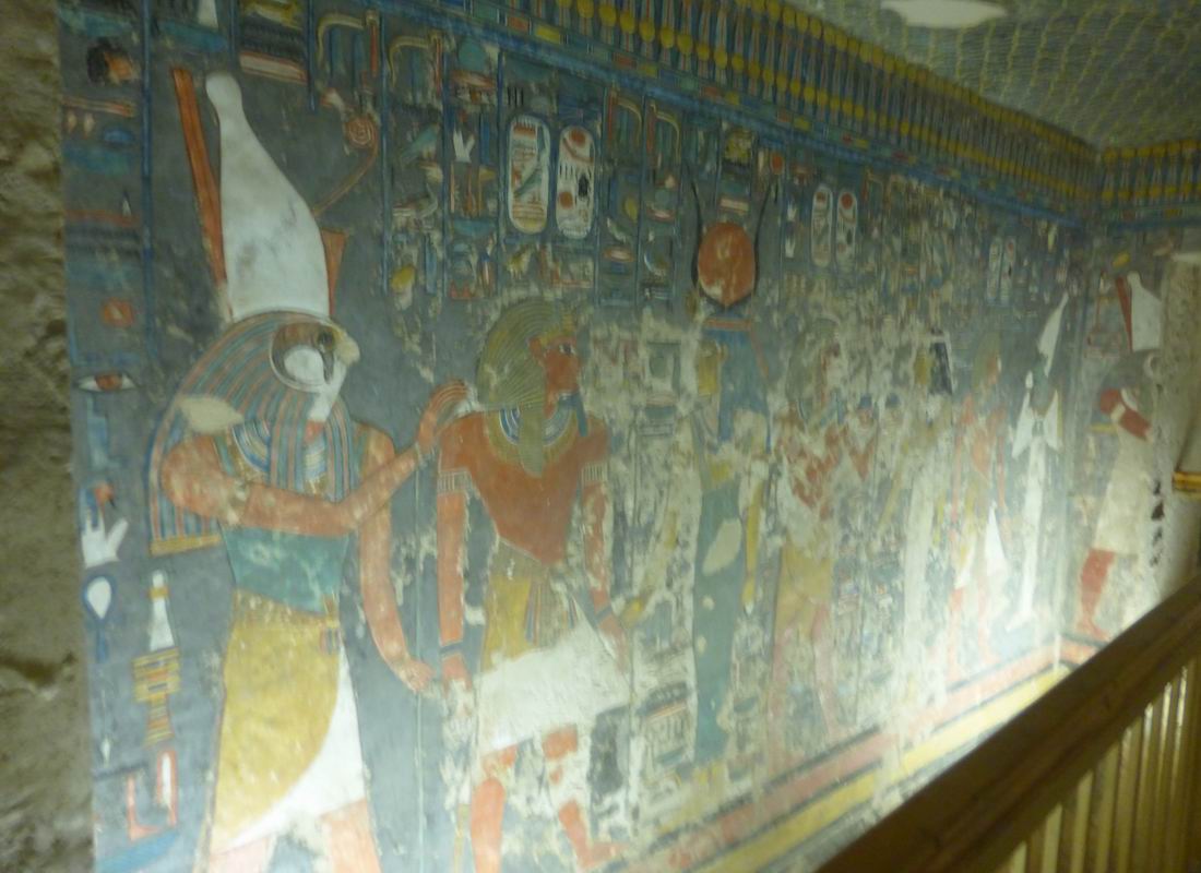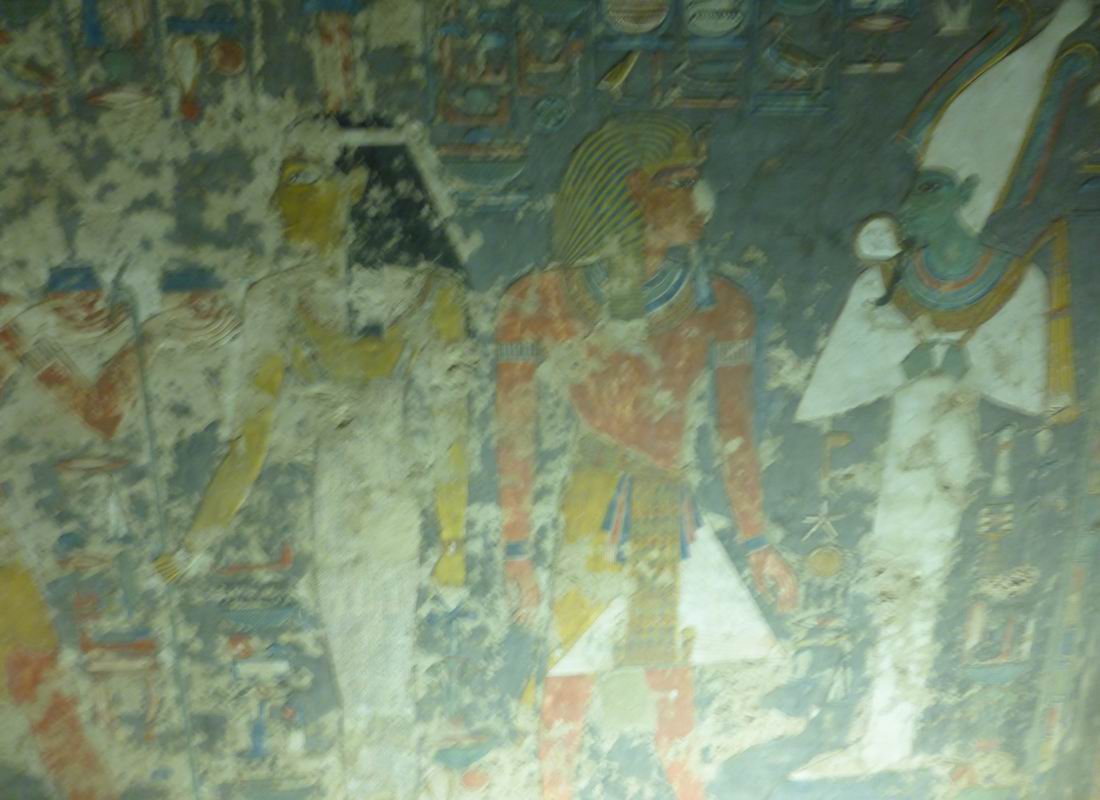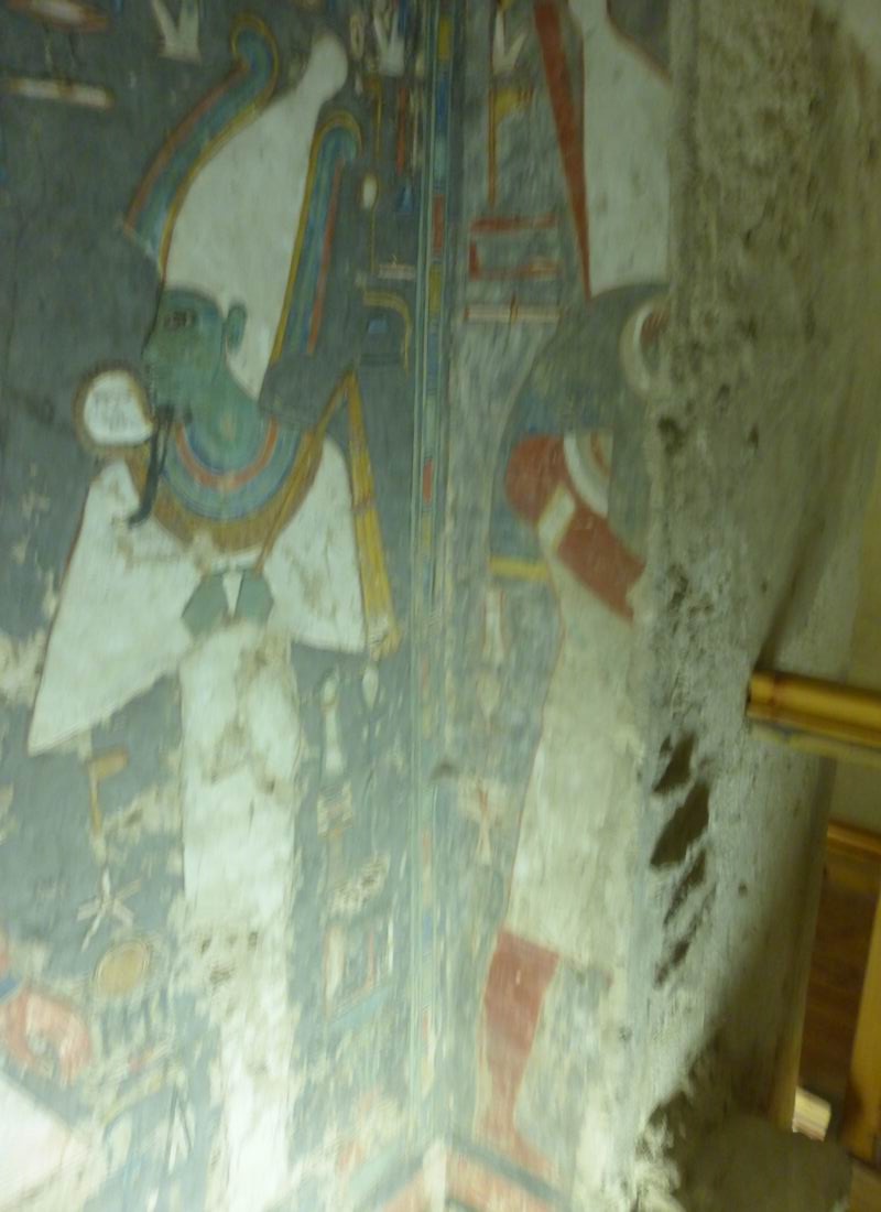 La salle du puits. Sur le mur Nord, à droite, le roi (aujourd'hui disparu) comparaissait devant une grande figure d'Osiris, trônant sur un siège décoré du séma-taouy, accompagné d'Anubis et d'Horus. A gauche une scène semblable lui aurait fait face, mais elle est détruite par l'ouverture de la porte, il n'en reste plus qu'une figure à demi conservée d'Horus. La salle du puits et l'antichambre sont toutes deux consacrées à l'accueil du roi par les divinités. |