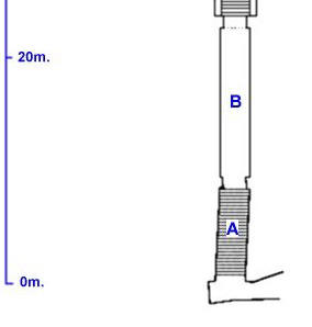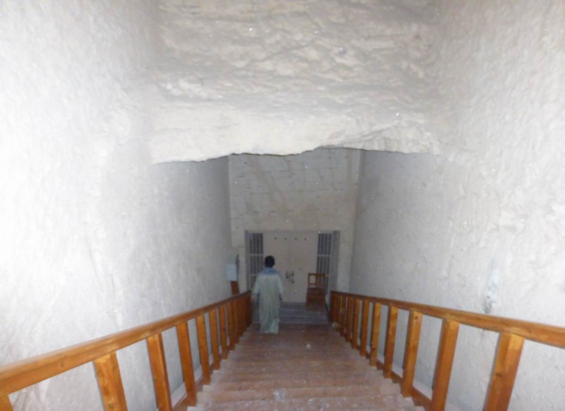 profond. Cet escalier nous amène, après passage à travers la porte moderne, dans un corridor pentu (B). ![]() |