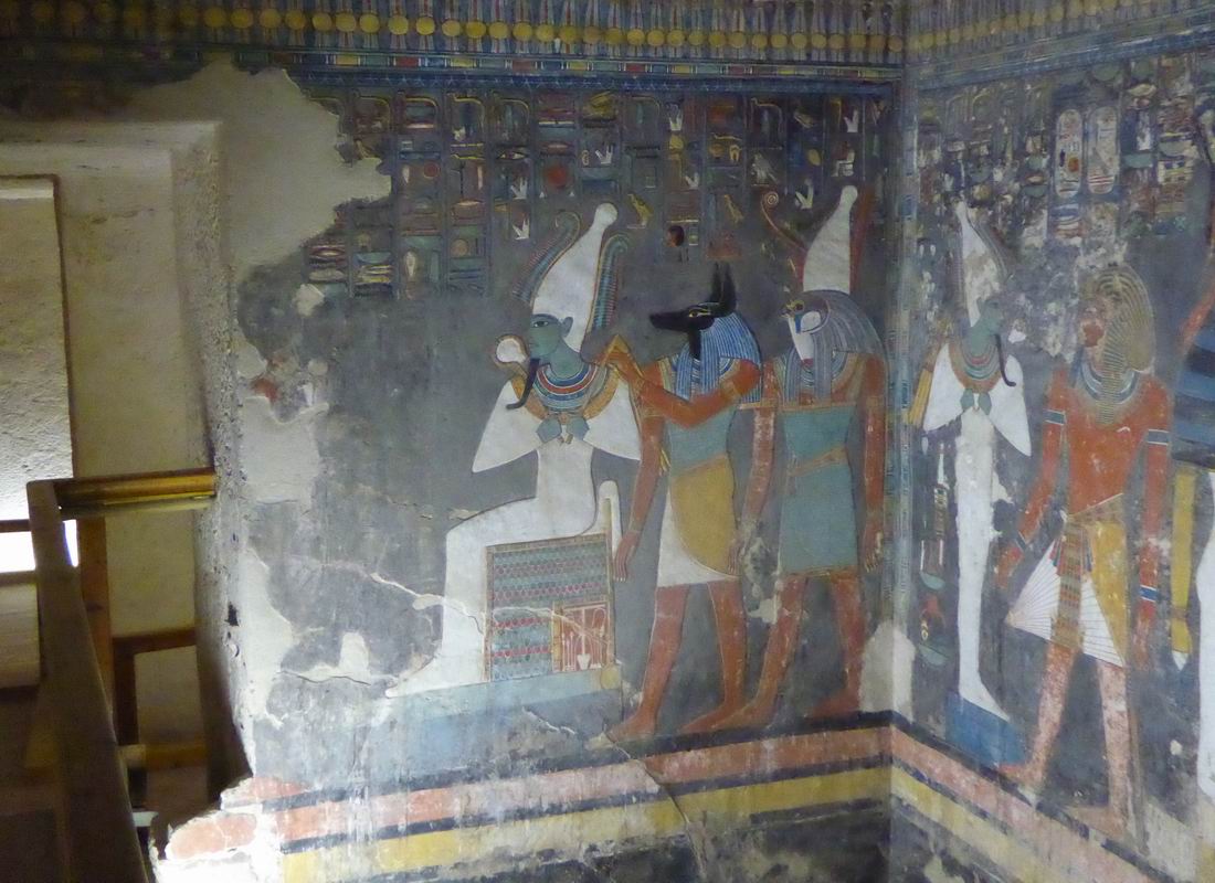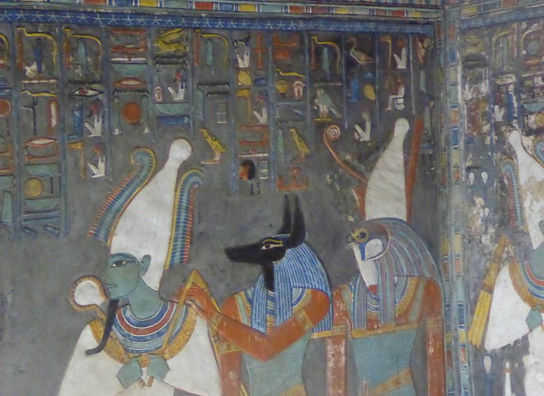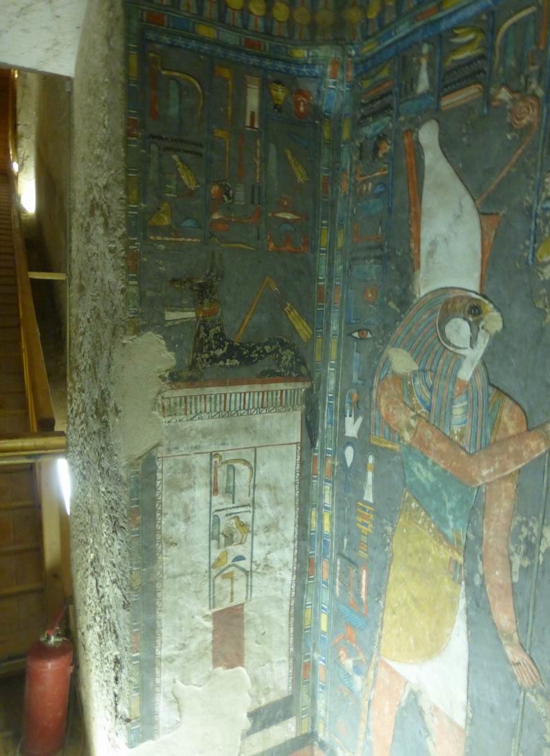 gauche la descenderie (E) qui conduit à la salle du puits. Sur le mur Ouest de la chambre du puits le dieu Anubis est couché sur le toit d'un naos. La colonne, sous Anubis, commence par : "paroles à dire pour Anubis". A droite le dieu Horus présente le roi à la déesse Isis. |