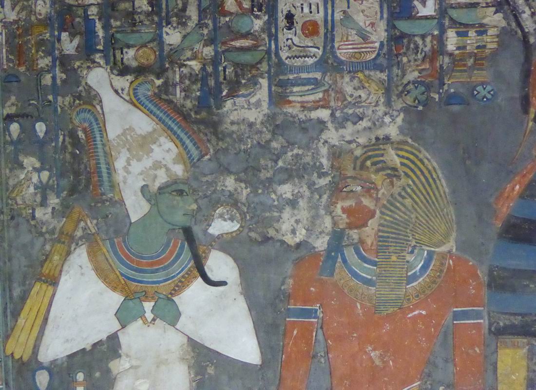 Le roi devant Osiris-Ounnefer. Le roi à la barbe droite, tandis qu'Osiris possède la barbe recourbée, d'un dieu défunt. |