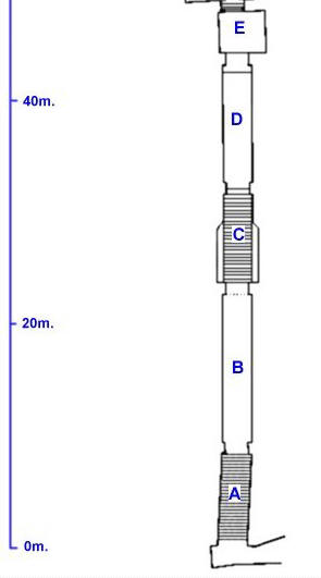 pentu (D), nous arrivons à la salle du puits (E). Notre périple de 45 m nous
