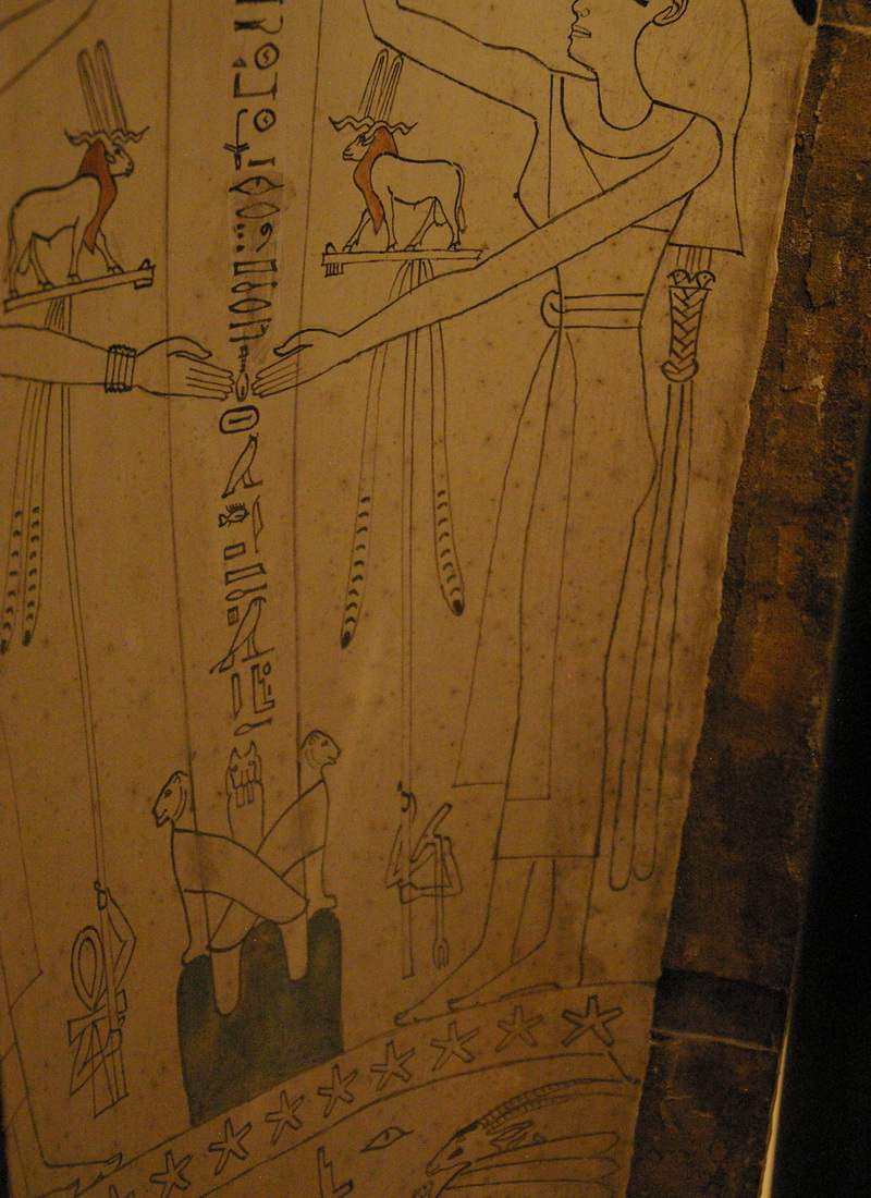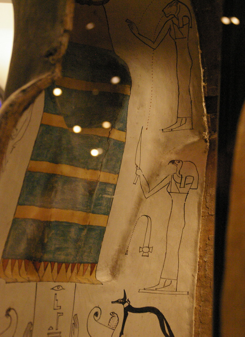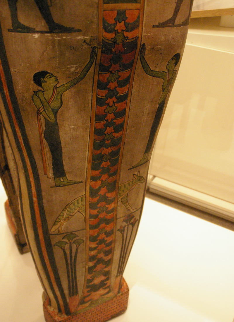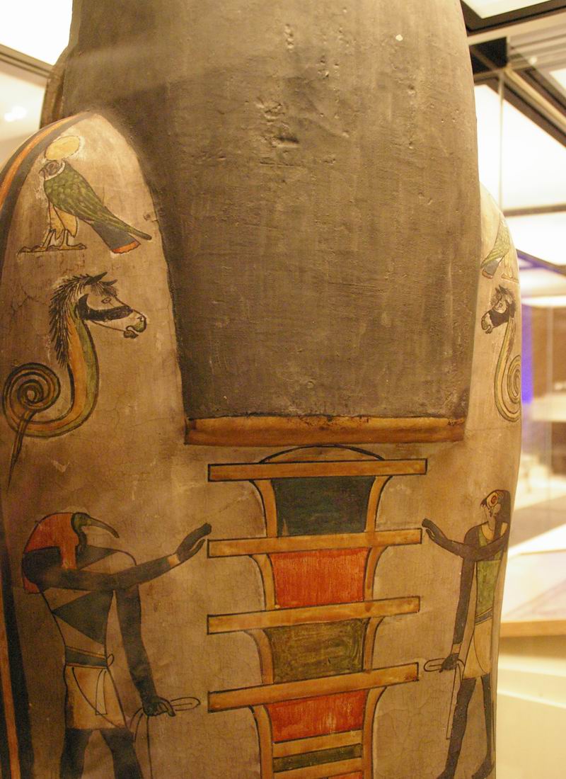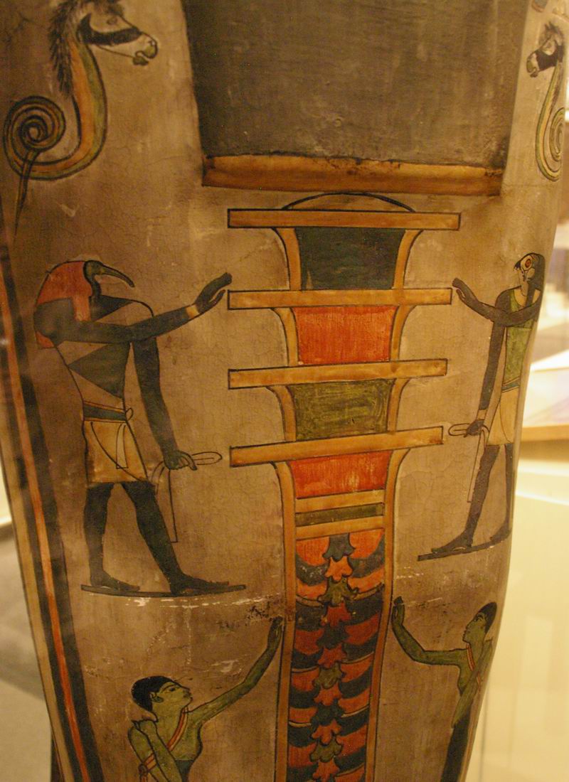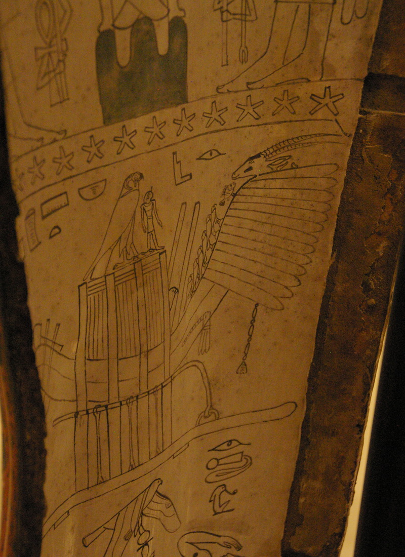 colonne, gravée de hiéroglyphes, fait office de pilier. Deux déesses, Isis et Nephthys protègent le reliquaire. Au-dessus des déesses l'on trouve des canidés qui possèdent une longue queue. Les canidés sont debout sur une enseigne, il pourrait s'agir di dieu Oupouaout, "l'ouvreur des chemins". |