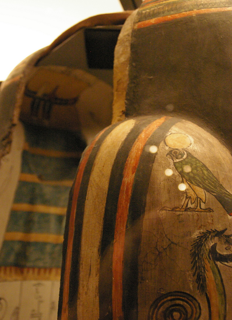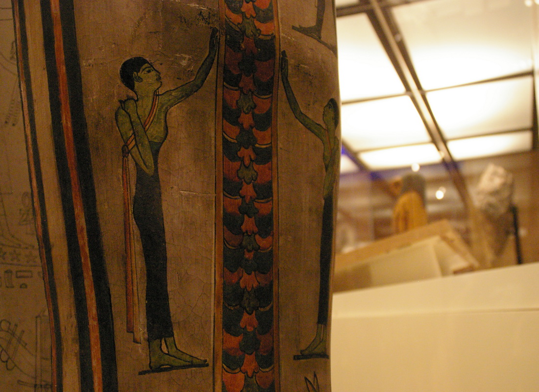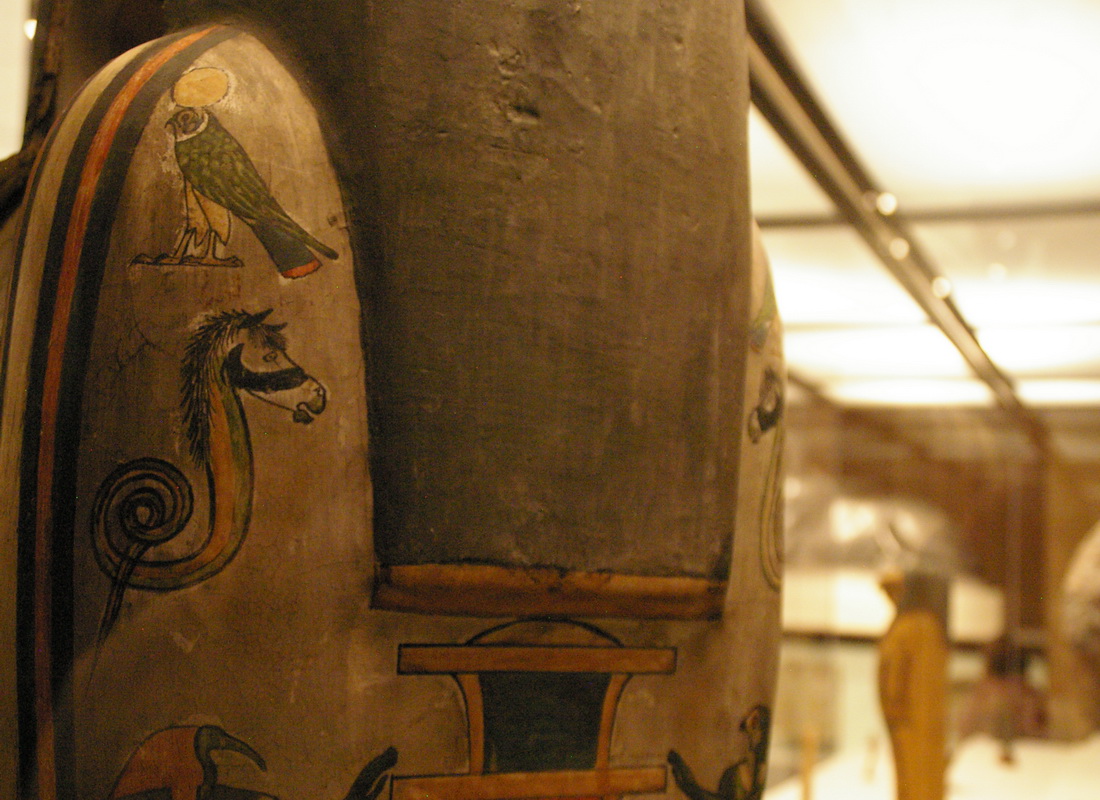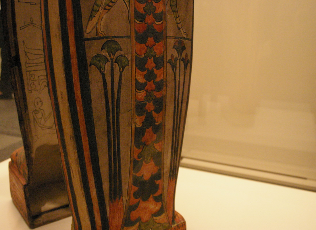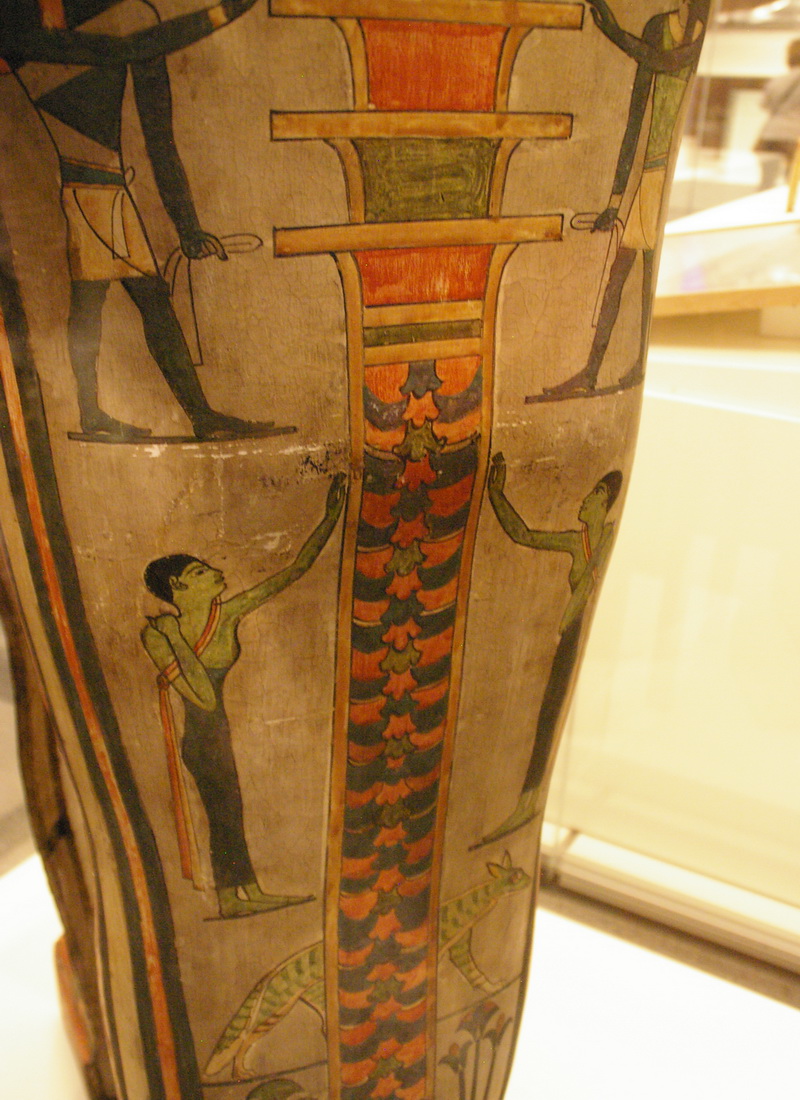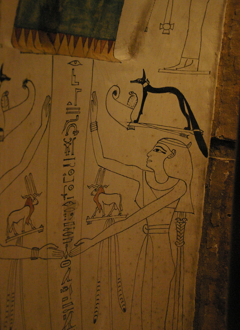colonne, gravée de hiéroglyphes, fait office de pilier. Deux déesses, Isis et Nephthys protègent le reliquaire. Au-dessus des déesses l'on trouve des canidés qui possèdent une longue queue. Les canidés sont debout sur une enseigne, il pourrait s'agir di dieu Oupouaout, "l'ouvreur des chemins". |
