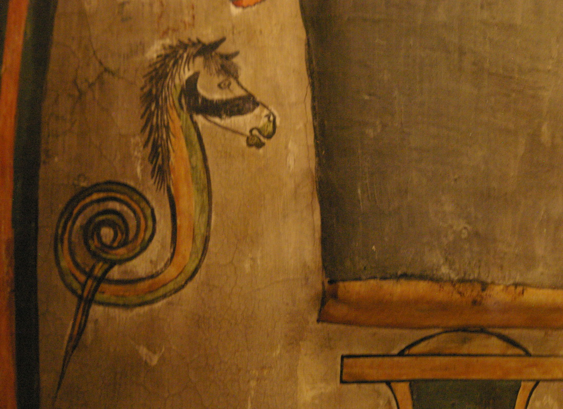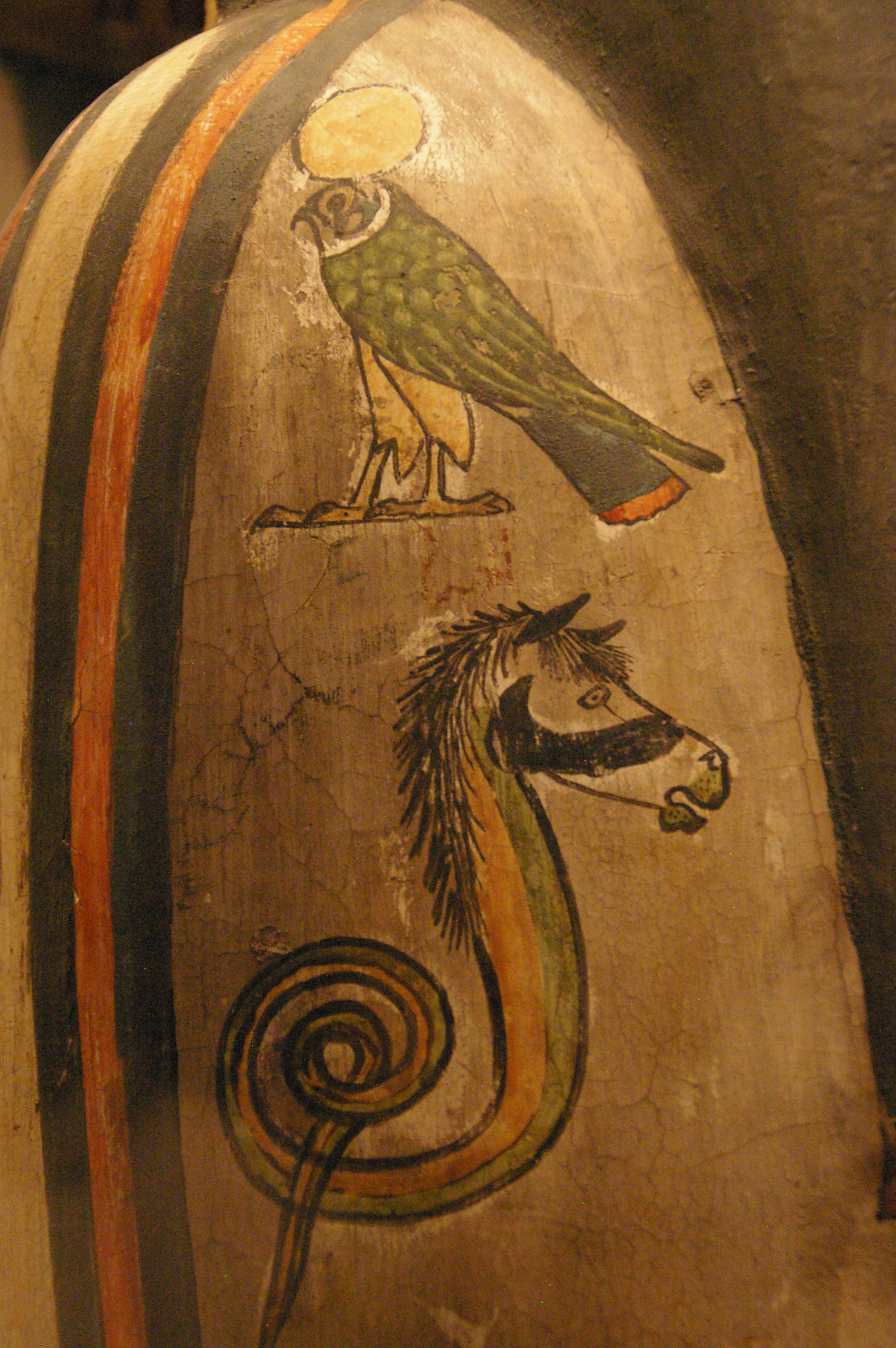 | Sous le faucon solaire nous trouvons un être hybride composé d'une tête de cheval et au corps de reptile. |