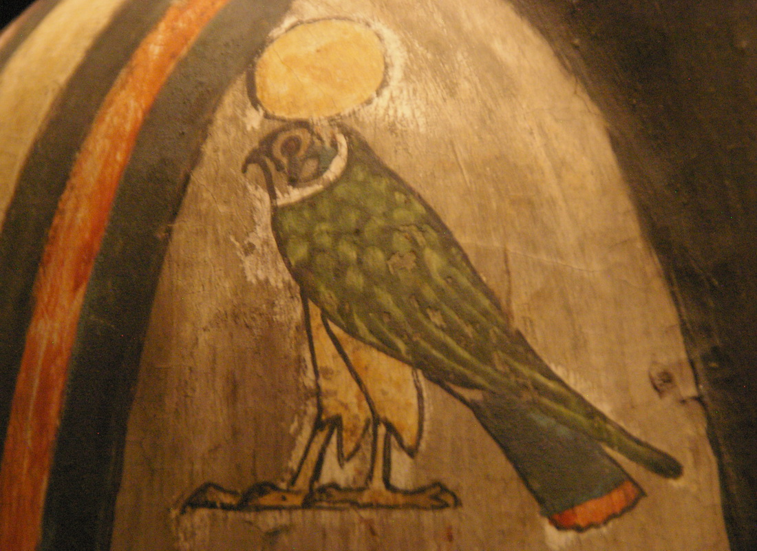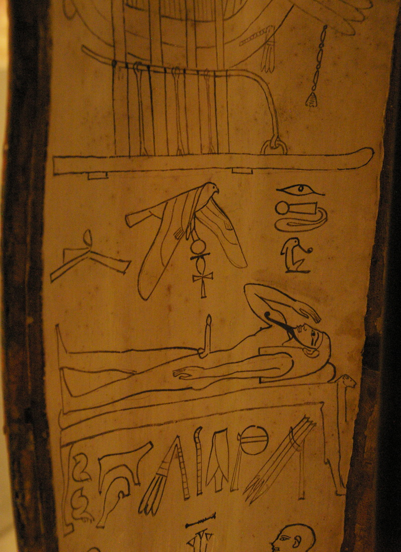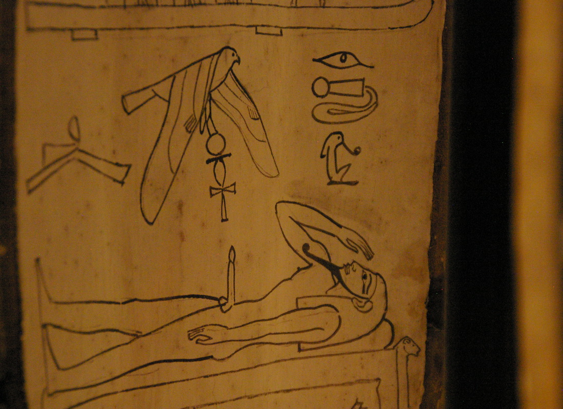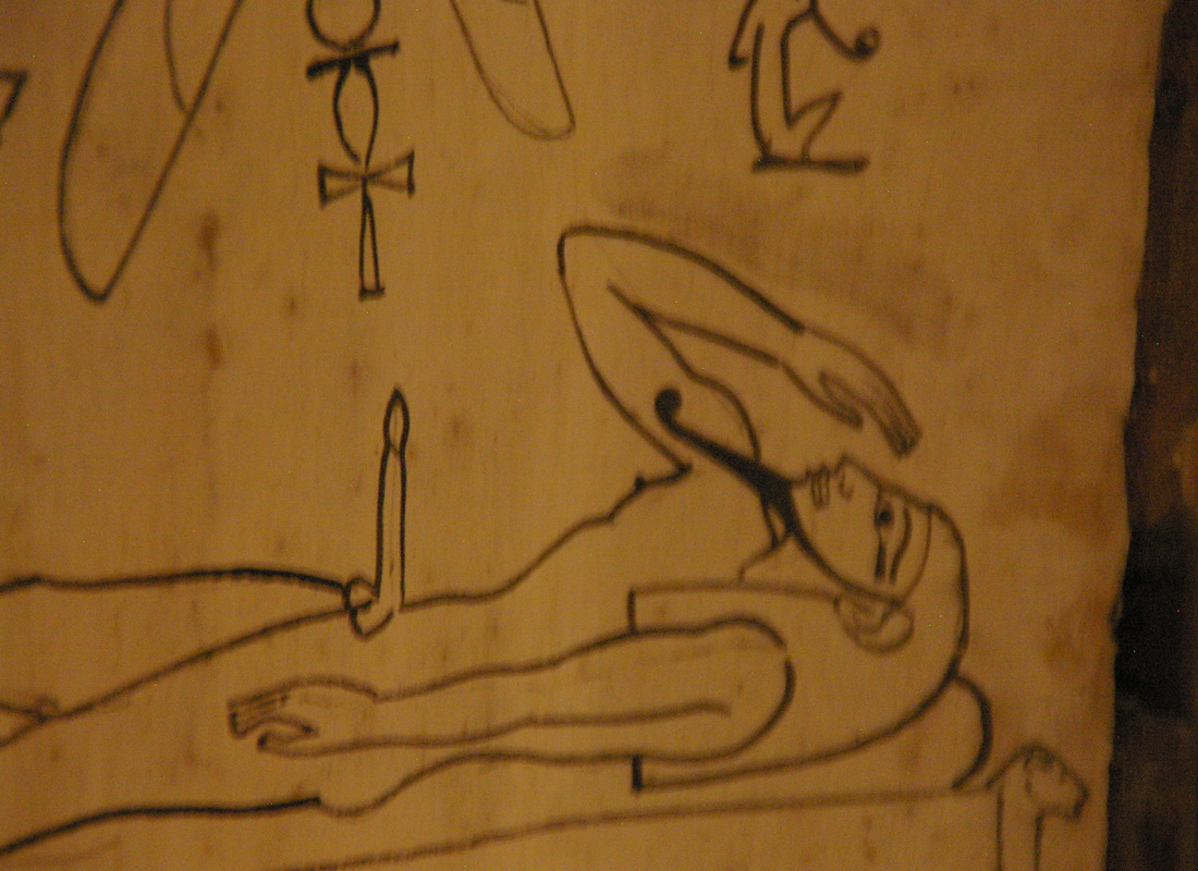est un Osiris, revient à la vie. Son sexe dressé, signe de vitalité, est "survolé" par le milan qui tient dans ses serres l'ankh, "la croix de vie". |