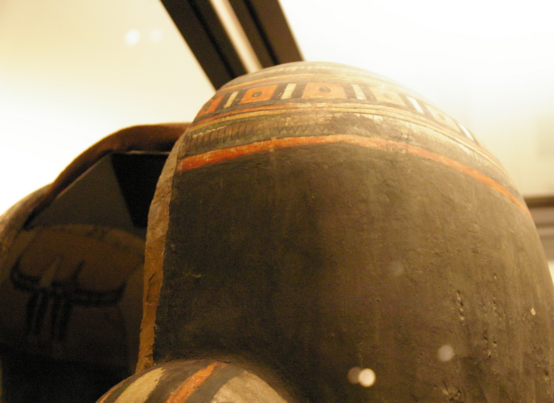 décoré. Décorations de l'intérieur du cartonnage qui fait office de couvercle. Un génie à tête de lionne crache. Au-dessous, un génie, à tête de vautour, tient un couteau, devant le génie représentation d'une flamme. Les génies protègent le reliquaire d'Osiris qui renfermait la tête du dieu démembré. |