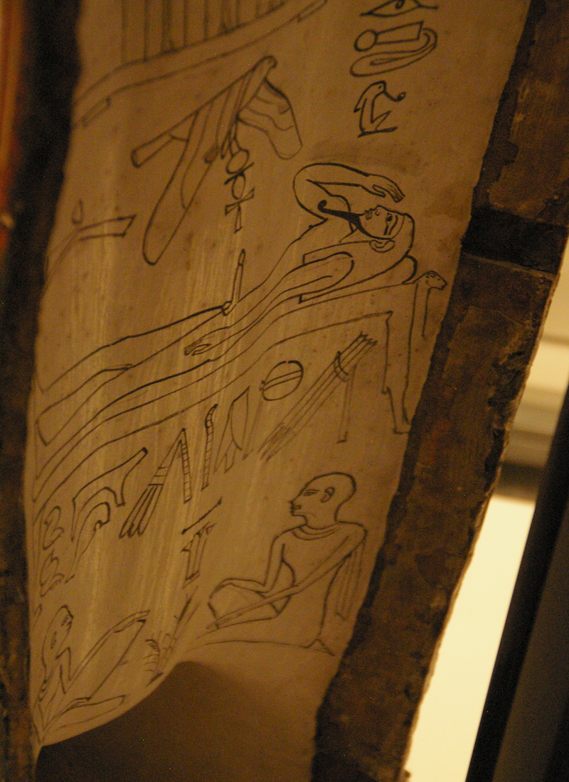| Une frise d'étoiles évoquent le ciel et au-dessous nous trouvons la barque du dieu Sokar. |