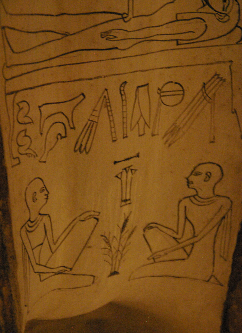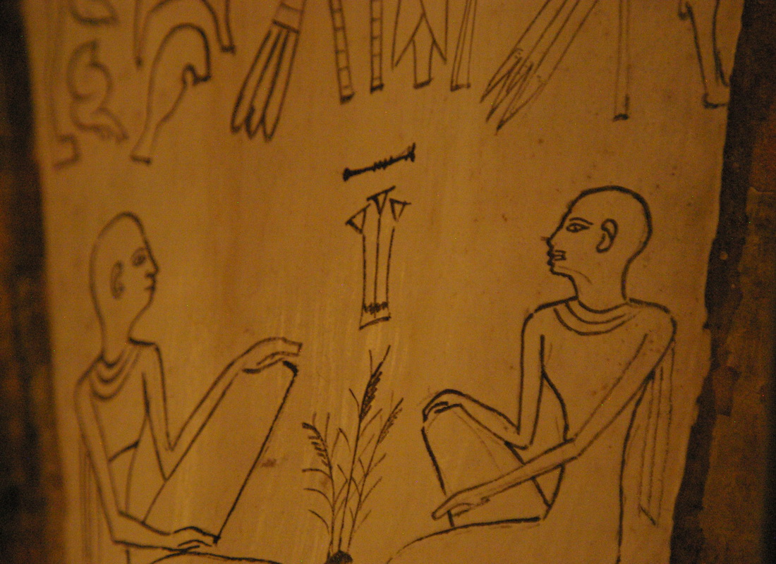 | Entre les deux personnes nous trouvons une touffe de papyrus et des épis de blé. |