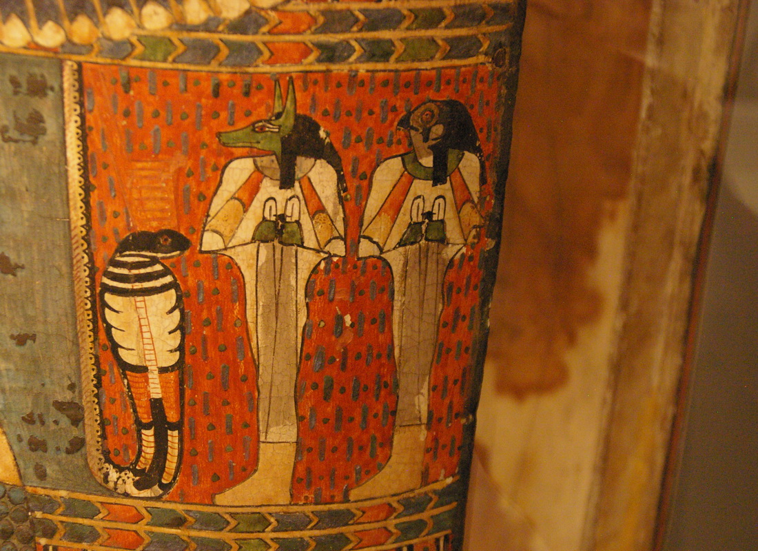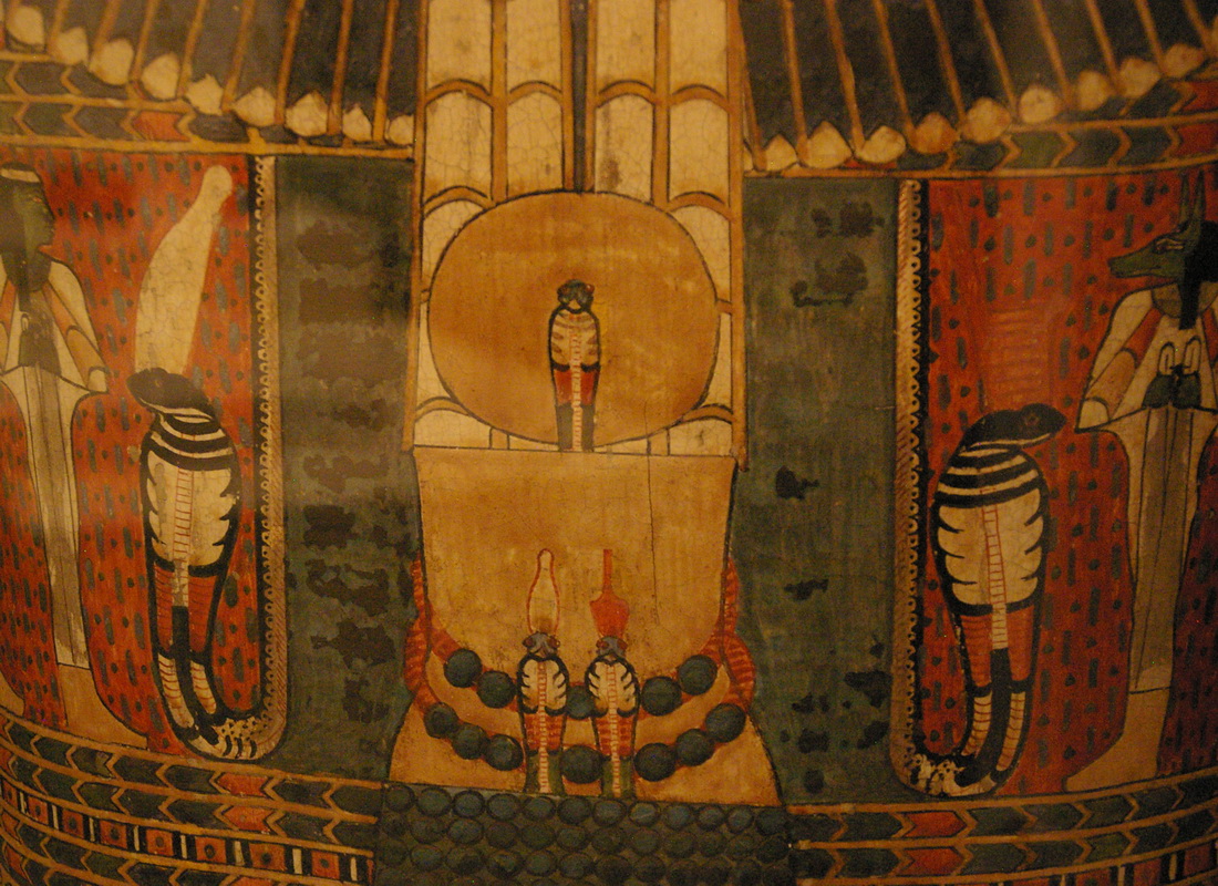 des étoffes. Un cobra dressé, coiffé de la couronne stylisé de Basse Egypte, est placé devant les deux divinités. Douamoutef, à tête de chien et Qebehsenouef, à tête de faucon. |