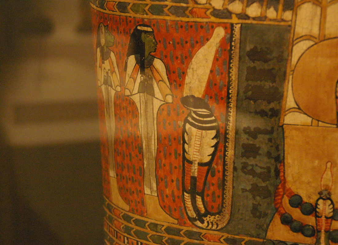 des étoffes. Le cobra est coiffé de la couronne blanche de Haute Egypte. Amsit, à visage humain, et Hapy, à tête de singe. |
