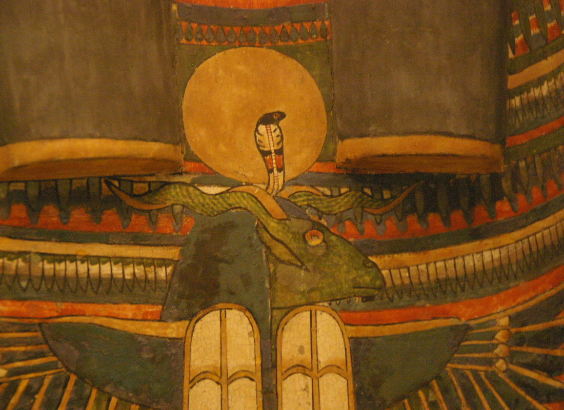 | La tête du bélier est coiffé du disque solaire accompagné de l'uraeus. |