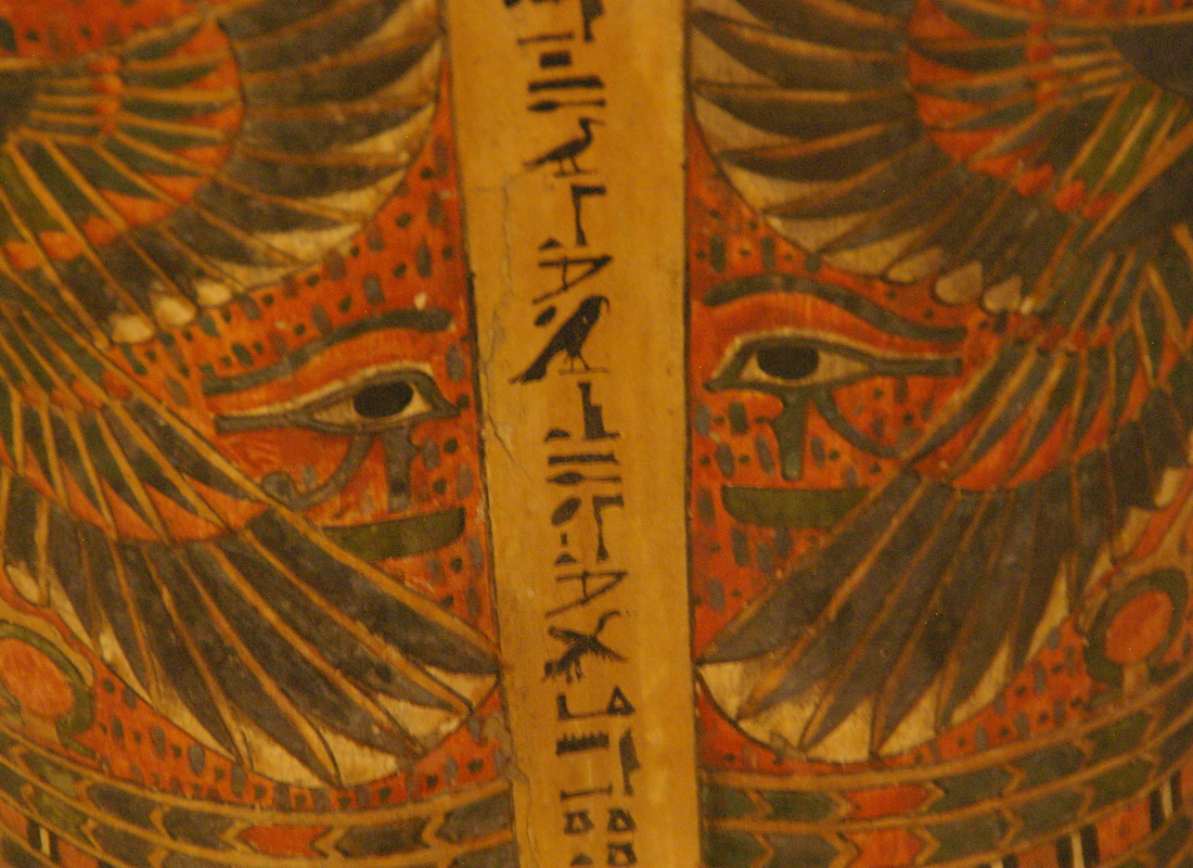| De même deux faucons étirent leurs ailes et enserrent un œil oudjat. |