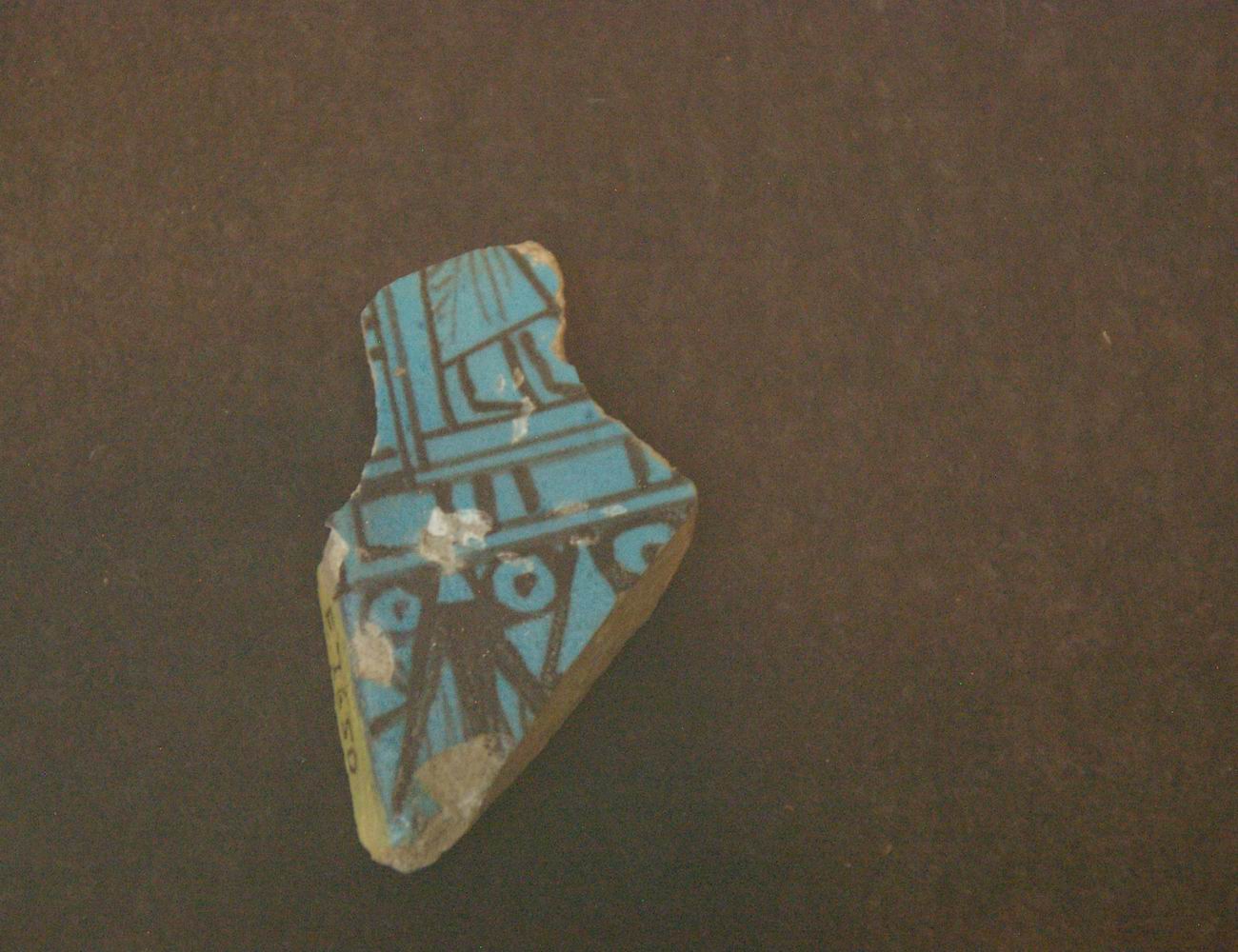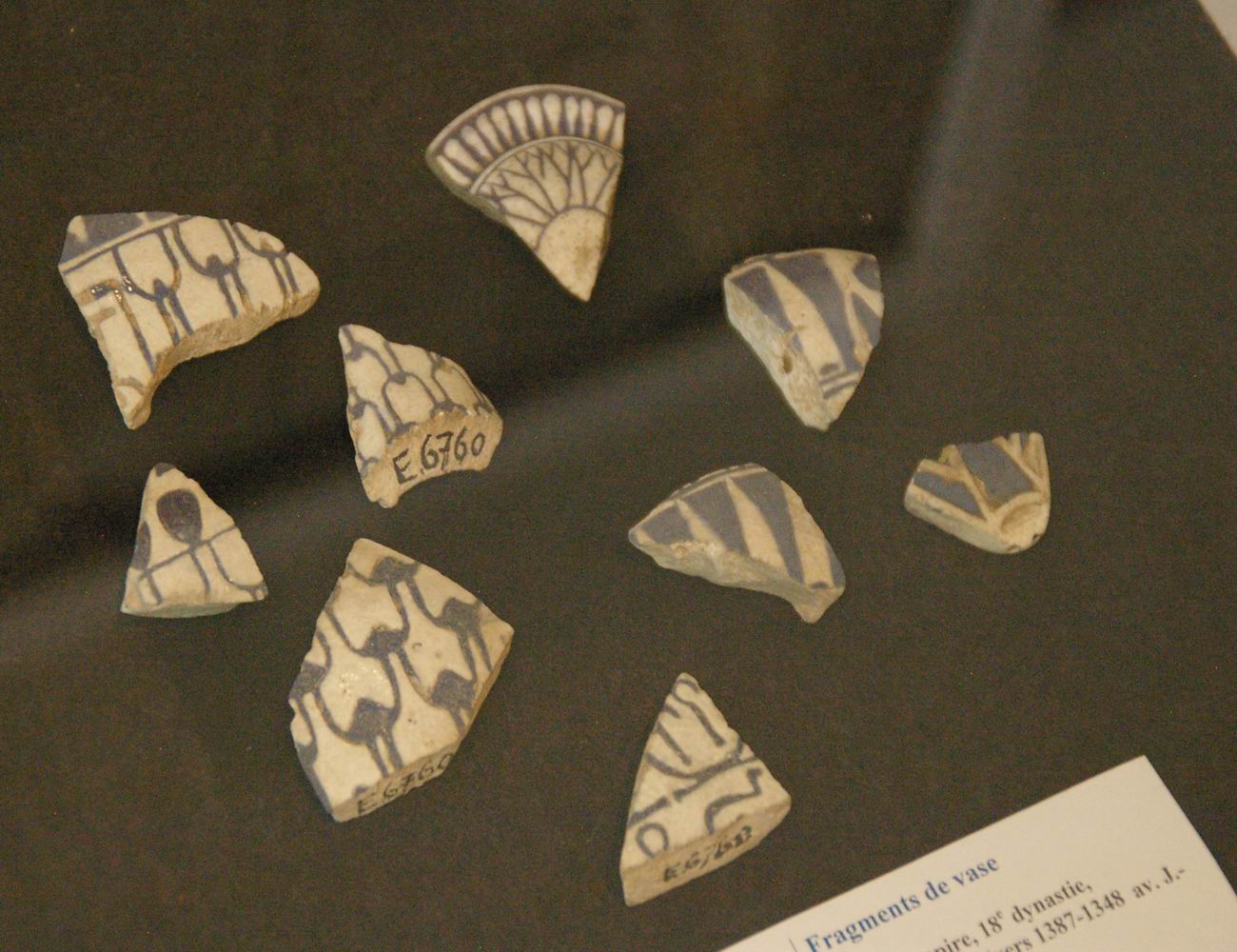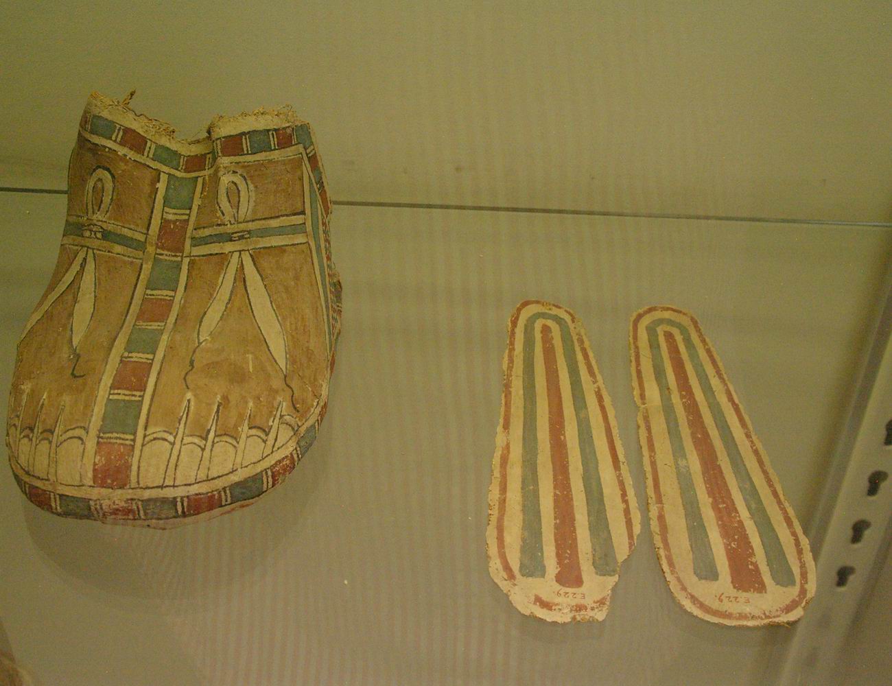 motif linéaire. Cette paire de semelles en lin recouvert de stuc peint provient des fouilles de B. Grenfell et A. Hunt au Fayoum au début du XXème siècle. Elles faisaient vraisemblablement partie de l'équipement d'une momie, datant de la Période Ptolémaïque. |