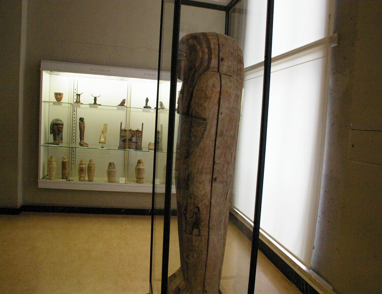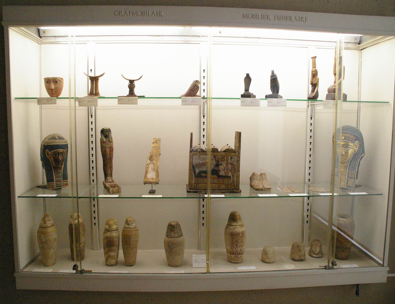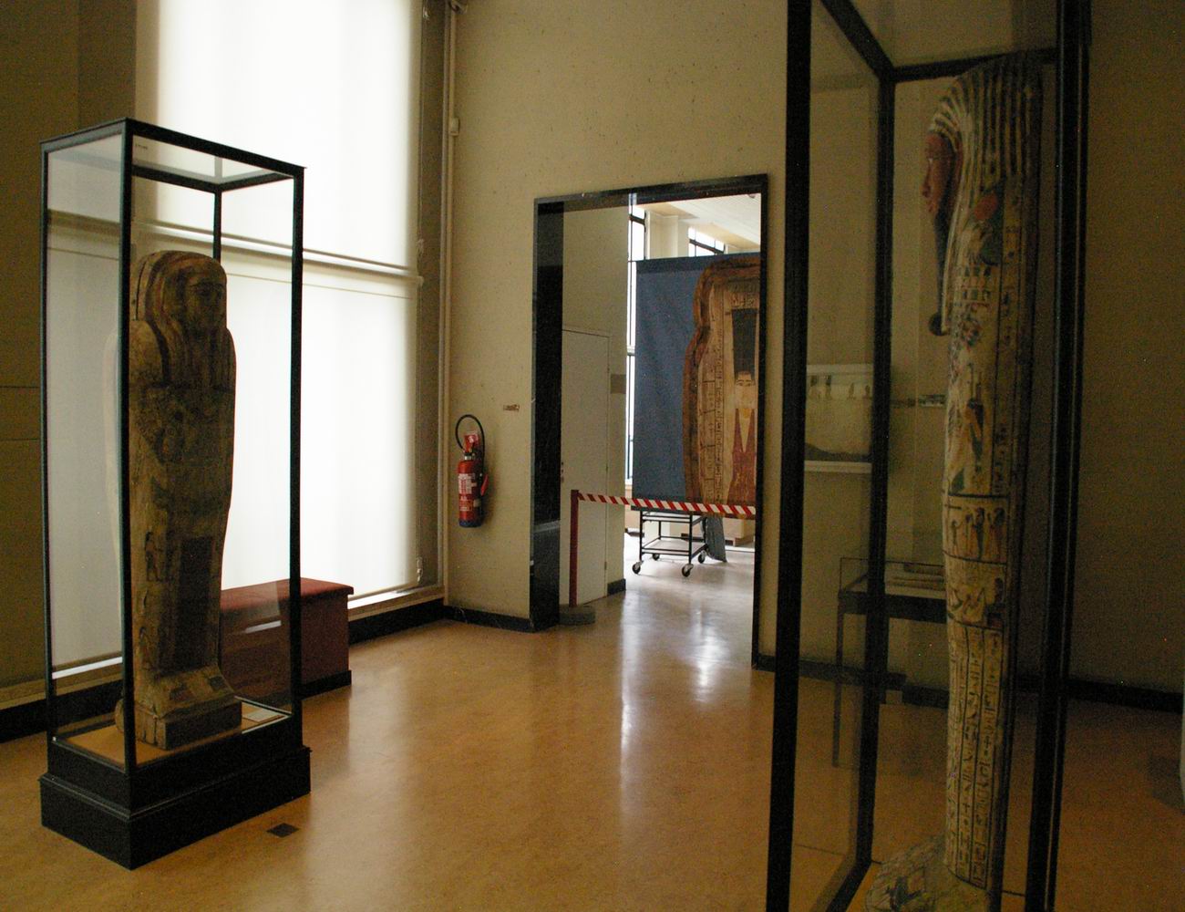 Sarcophages. La salle non accessible au mois d'août 2018 contient des objets de la période ramesside, Basse Epoque et des momies. |