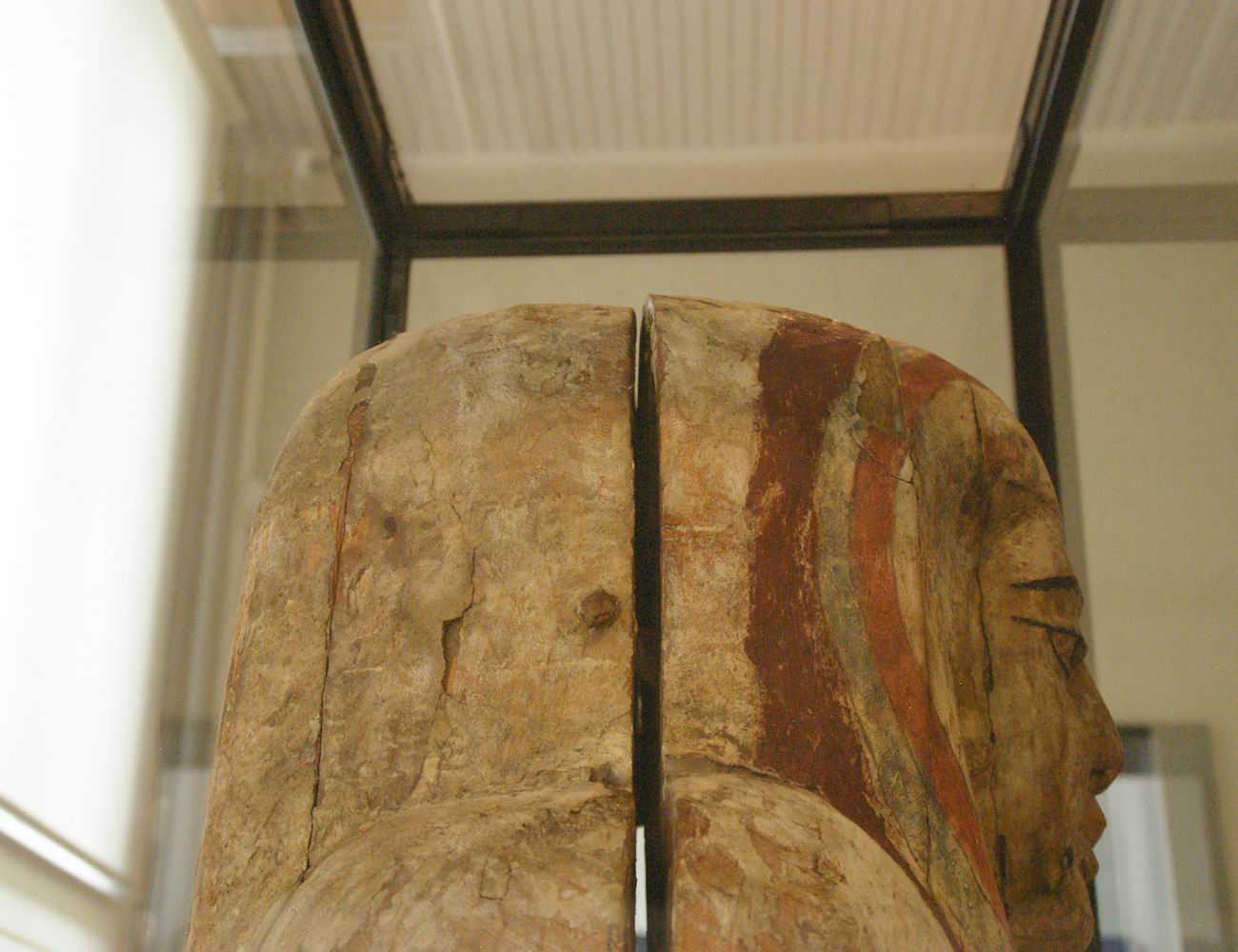 tête de la momie pour conjurer les effets néfastes des mauvais génies. Cet hypocéphale, qui date de la Période Ptolémaïque, se distingue par une surface peinte en noir. |