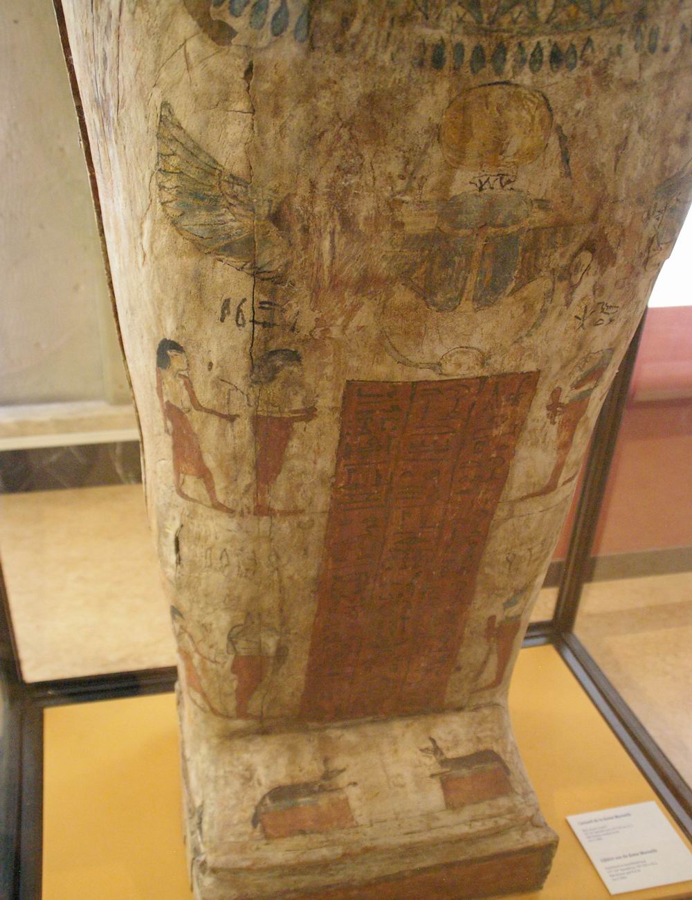 positionné au-dessus des trois colonnes de hiéroglyphes. De part et d'autre du texte nous avons les quatre Enfants d'Horus. Le dieu Anubis, couché sur une chapelle, est positionné, deux fois, aux pieds du couvercle. |