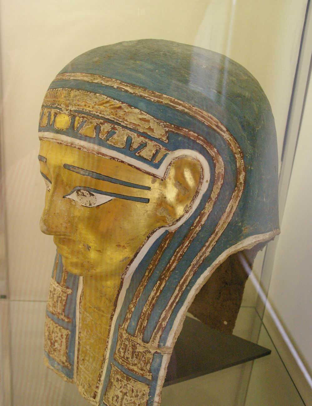 ptolémaïque. Ce masque de momie de la fin de la Période Ptolémaïque est de style traditionnel, mais de fabrication remarquable. Le visage est recouvert d'une feuille d'or, qui symbolise la chair des dieux et par cela l'éternité. Les yeux et les sourcils sont peints en bleu. La perruque, également de couleur bleue, est ornée d'un motif en forme d'ailes étendues et d'un collier de perles. La partie inférieure de la perruque est décorée de figures divines (?), difficiles à distinguer actuellement. Le collier doré est composé de motifs floraux. |