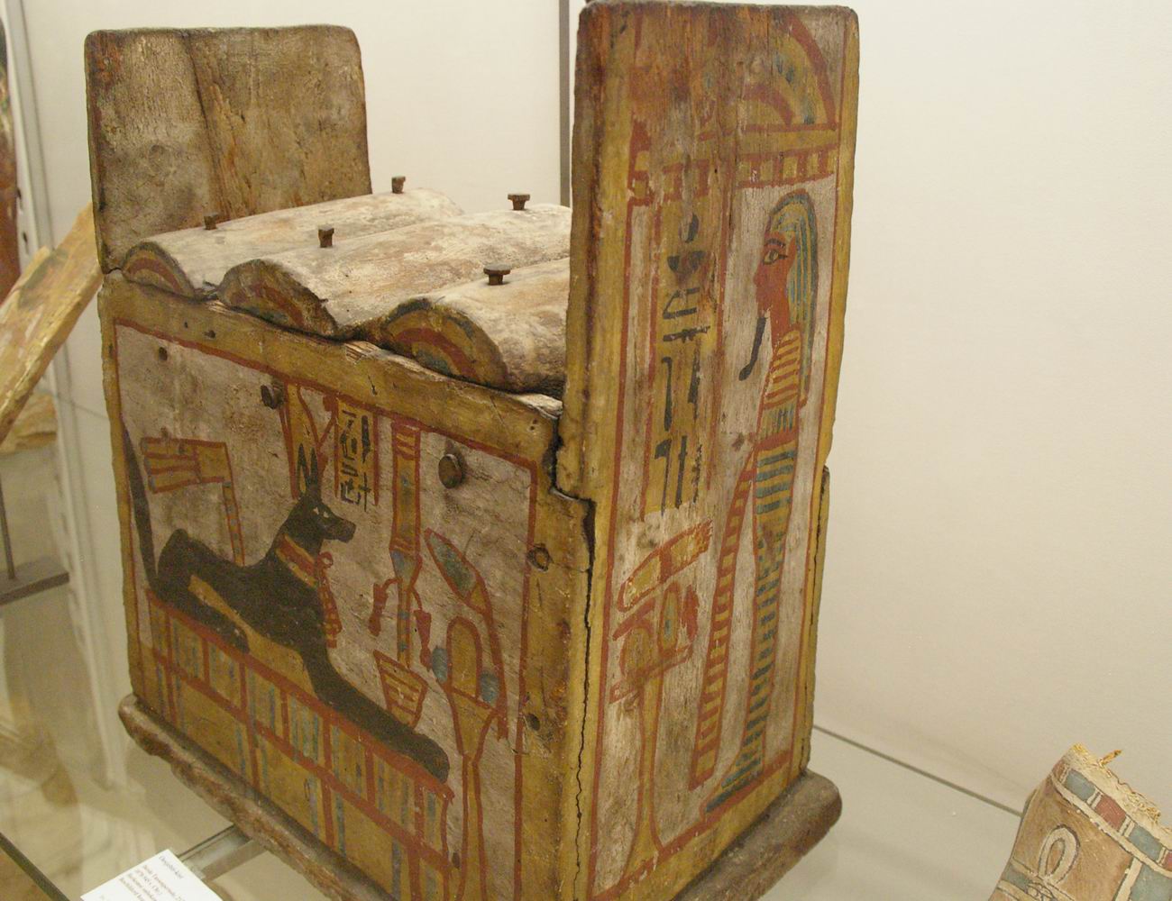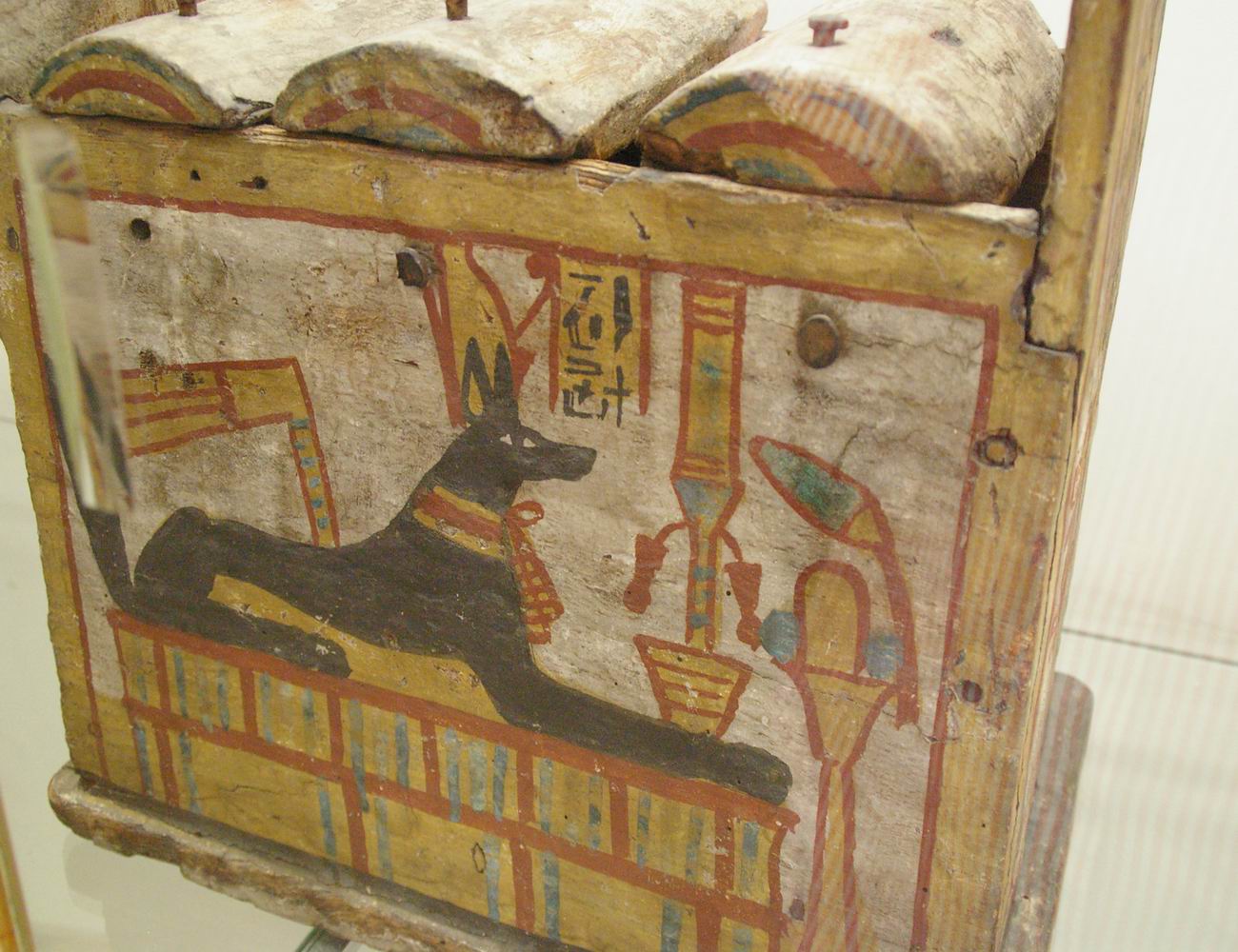 compartiments. Le dieu Anubis, couché sur un coffre, est coiffé de la double couronne. Sur le petit côté nous avons Amsit, un des Enfants d'Horus. |