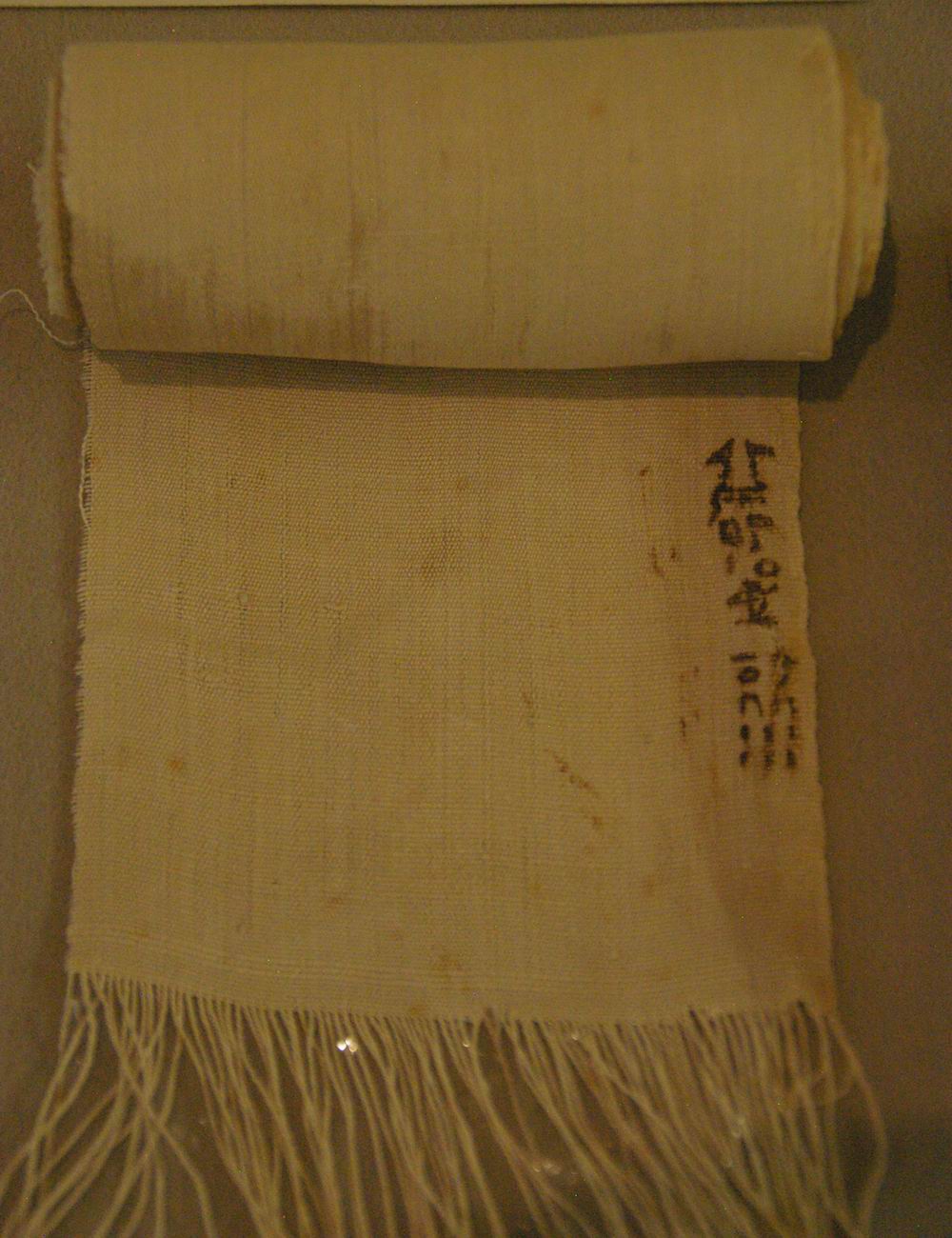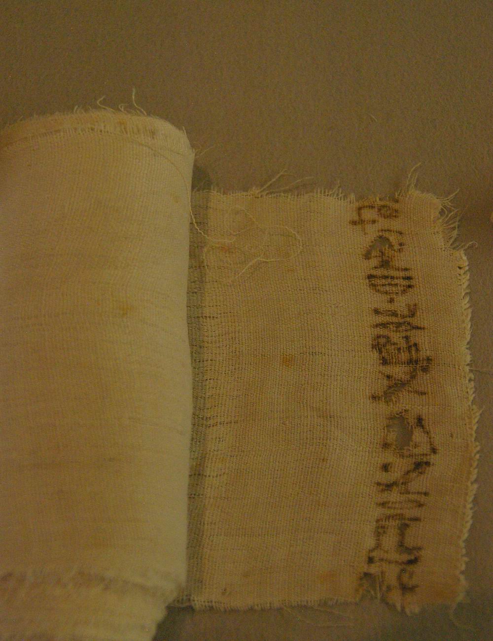 Bandelette de lin inscrite. Cette pièce fait partie de la catégorie des bandelettes spécifiques datant de la XXIème Dynastie. L'inscription hiéroglyphique nous apprend qu'elle appartenait à un prêtre thébain nommé Harsiésis. |